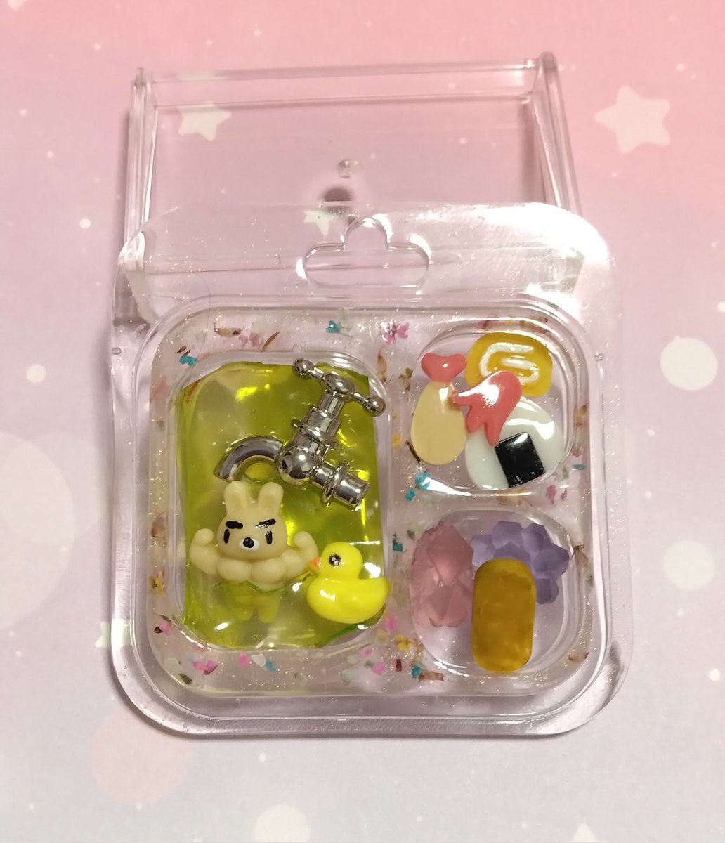 ムキムキうさぎちゃんがお弁当を持ってお宝を発掘してお風呂でリフレッシュするって言うのを表したかったんだけど…。 蛇口が大きすぎる💦 #パッケージモールド #レジンアクセサリー #試作品 pic.x.com/jSh6gDztjl
