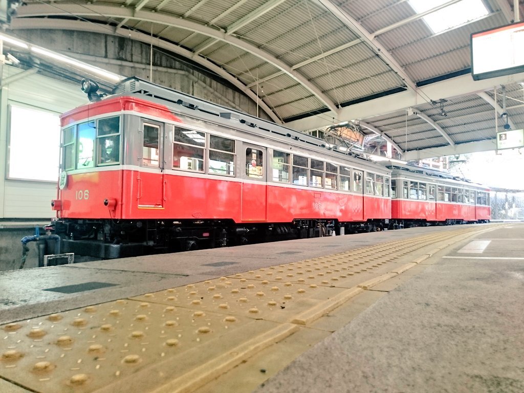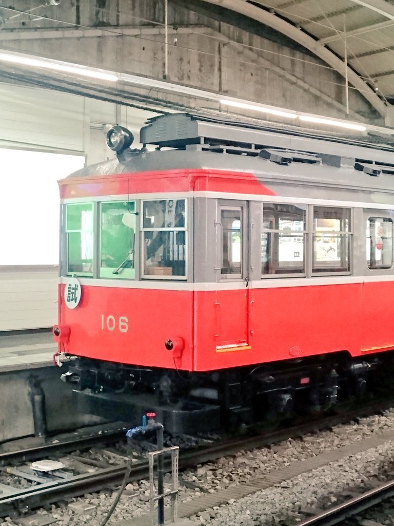 『 #箱根登山電車 の車両たち🚋』 箱根湯本駅の臨時線に停まっていた「ヨンロク」(並び順は逆で [モハ1形106号&104号])の写真です。 RPより引き続き、ちょっと珍しい方向幕(板)の写真ですが… #箱根登山鉄道 の100形車両たちは 方向指示がLEDや幕ではなく“板”なのです。 #方向幕 #試運転 #試運転幕 pic.x.com/geNseAmGgO x.com/okuyumoto/stat…