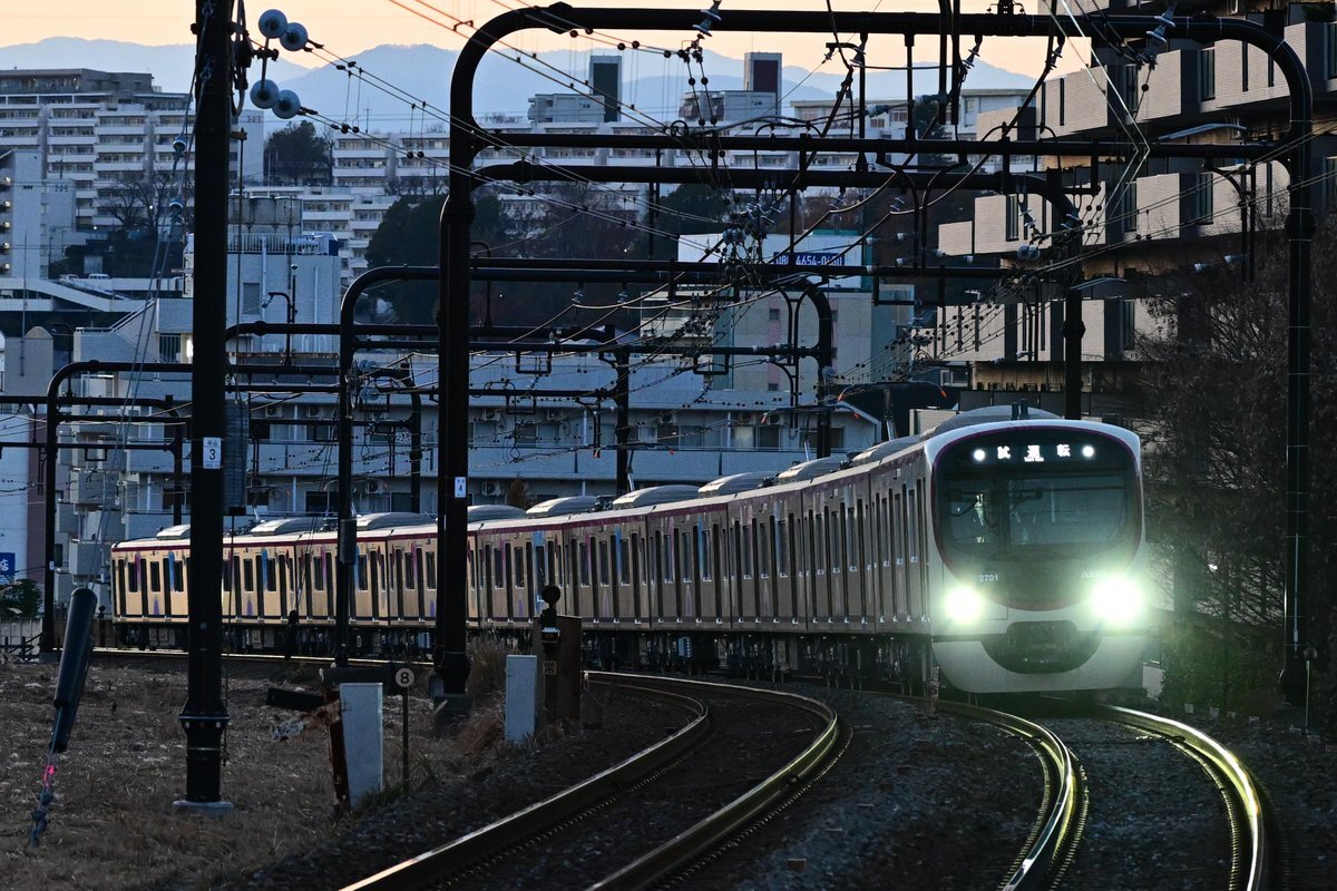 夕暮れ時の #京王2000系 9132レ 2025年12月10日撮影 2026年1月31日デビュー予定の京王2000系(2701F)をなかなか撮りに行けなかったのですが、きょうは日没後の #試運転 に間に合いました。ご一緒した皆さん、お疲れさまでした pic.x.com/QVWQNMt3LT