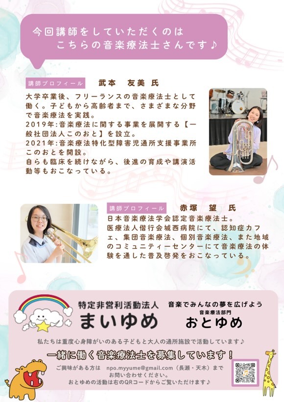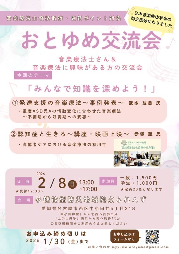 【音楽療法士さん向け講習会情報】 おとゆめ交流会 「みんなで知識を深めよう!」 この度、日本音楽療法学会認定団体に承認♪ 日時:2026年2月8日(日) 13:00~17:00 講師:武本友美先生・赤塚望先生 会場:多機能型地域防災拠点 ふれんず(名古屋市西区) #音楽療法士 #名古屋イベント #講習会 pic.x.com/pkzd4Yswq8