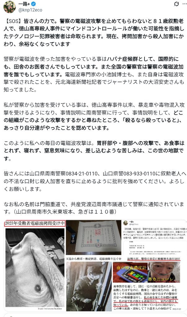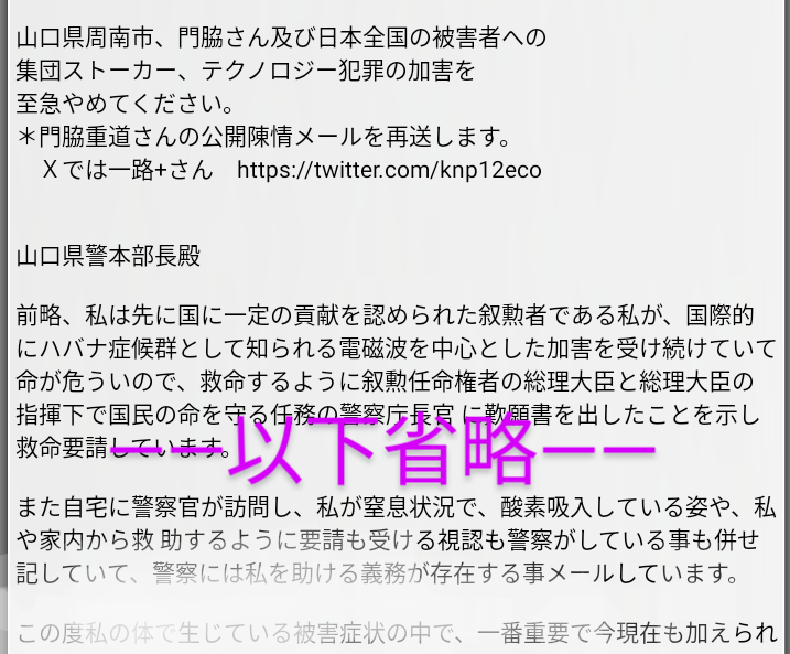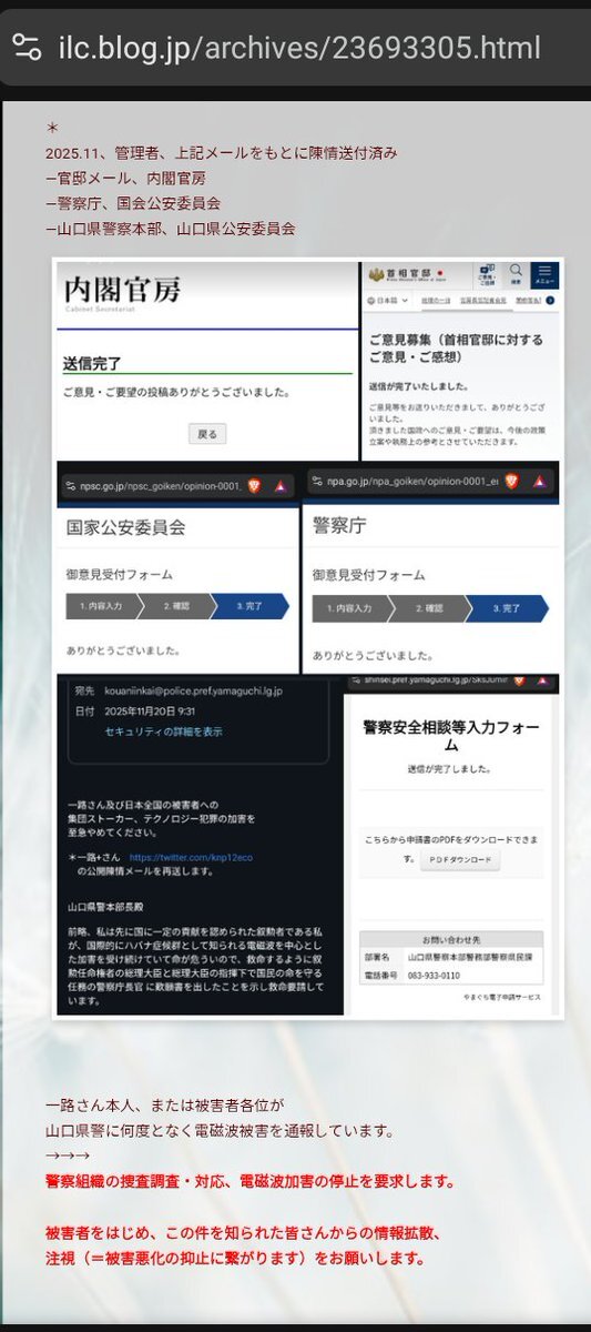 返信先:@NPA_KOHO他34人↑参照 11/20 陳情送信済です #集団ストーカー #テクノロジー犯罪 解決を要求します #高市早苗 @takaichi_sanae #内閣府 @cao_japan #警察庁 @NPA_KOHO #公安委員会 #山口県警 @YamaguchiPolice #周南警察署 * x.gd/RAAN8 一路+さん @knp12eco x.gd/RWOXD #SOS pic.x.com/f0JsxCuC3Y