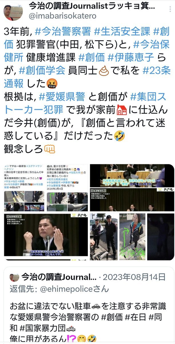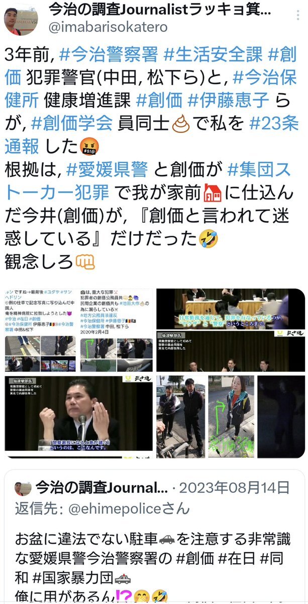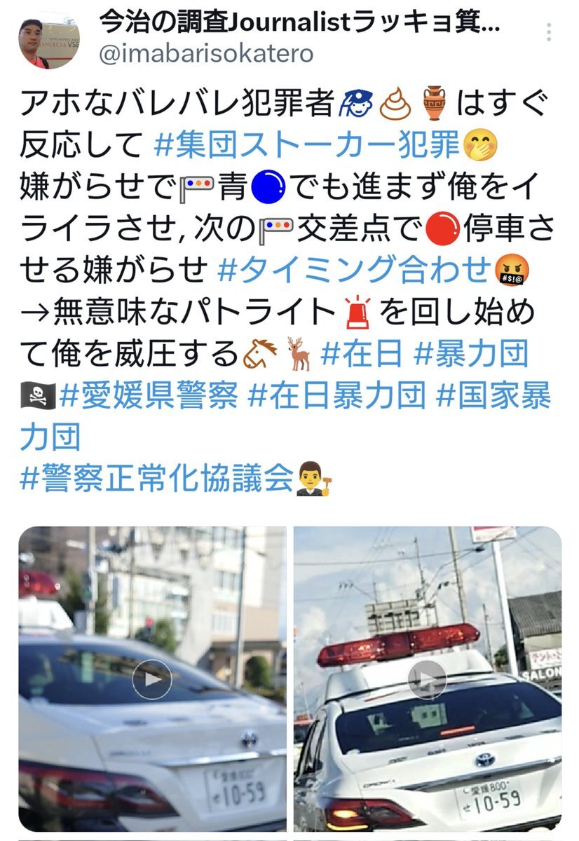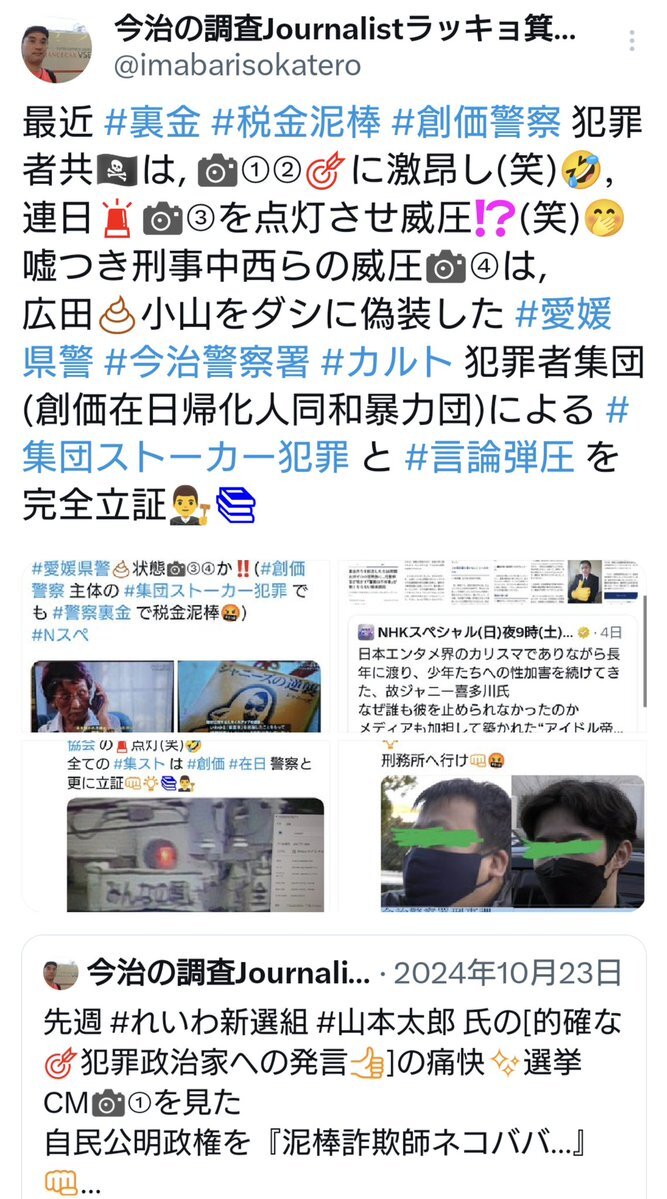 我が家前の賃貸🏠️を2015年から #集団ストーカー犯罪 に利用して,#テクノロジー犯罪(#盗聴 #盗撮)等アジト🏴☠️にしているお前ら犯罪者【#創価警察 #愛媛県警 #警察庁 #内閣情報調査室】が何言ってやがる‼️🤬 更に近所をこの犯罪者(#創価 #在日 #背乗り #帰化人 #同和 #暴力団)と加担者で固めておいて🤬 pic.x.com/SFtZbz1UPv x.com/NPA_KOHO/statu…