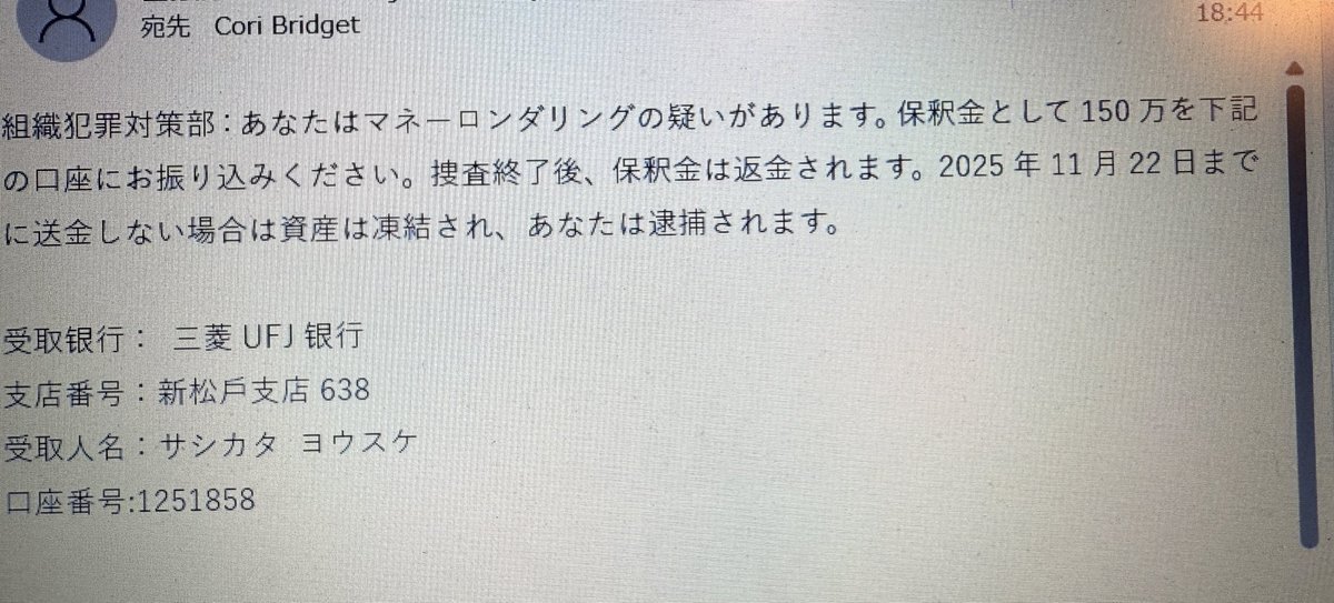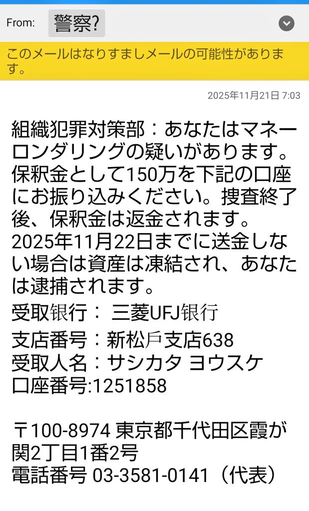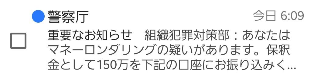 捕まってないのに保釈金、捜査終了したら保釈金は返金www また来た警察庁?からの迷惑メール。 もう少し日本のこと勉強してから出直してこい。 #迷惑メール #警察庁 pic.x.com/Lxz5yE7s1C