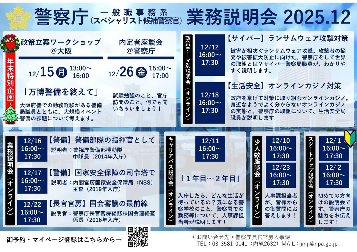 (一事)スペシャリスト警察官関係 12月の説明会に関する御案内です♪ 12月は東京と大阪で年末特別企画を開催いたします! そのほか様々なコンテンツでオンライン説明会も実施予定します ぜひ御参加ください! #警察庁 #説明会 pic.x.com/2dK4FfCkHQ