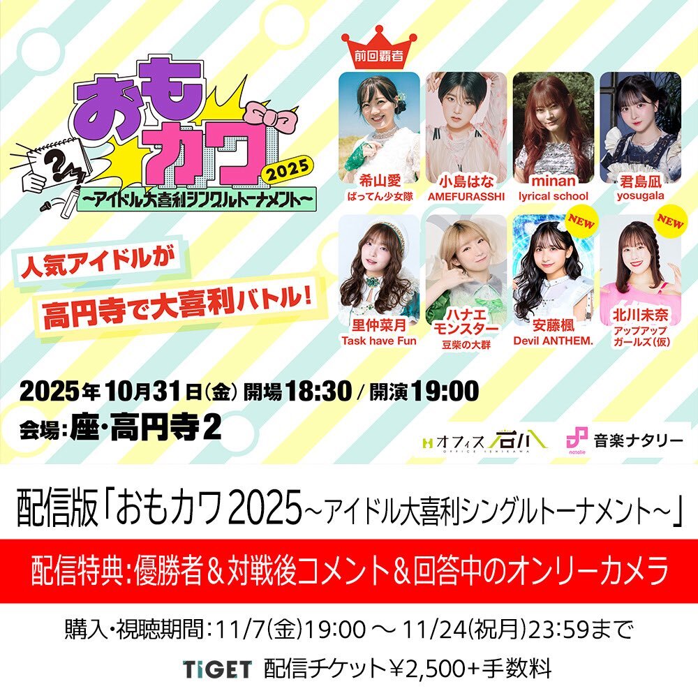 10/31(金)@座・高円寺2 おもカワ2025 前売完売!当日券もございません 今年も配信あります! ⚠️生配信ではございませんのでご注意ください。 本編はもちろん、対戦後のコメントや回答中のオンリーカメラも収録予定です! 販売・視聴開始は11/7(金)19時〜 約2週間の視聴期間は何度でもご覧頂けます x.com/natalie_mu/sta…