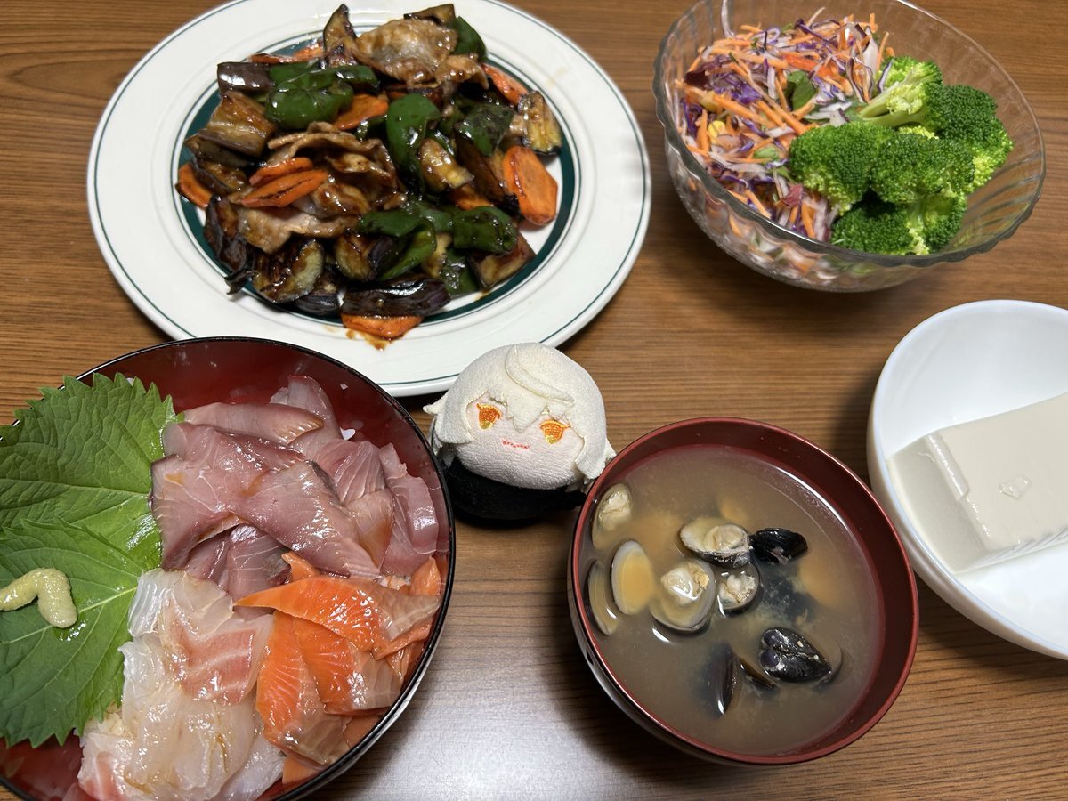 ゆうはん 3種野菜と豚肉オイスターソース炒め サラダ 海鮮丼 しじみ汁 冷や奴 #豆腐の日 pic.x.com/ODM3xCN7Cq