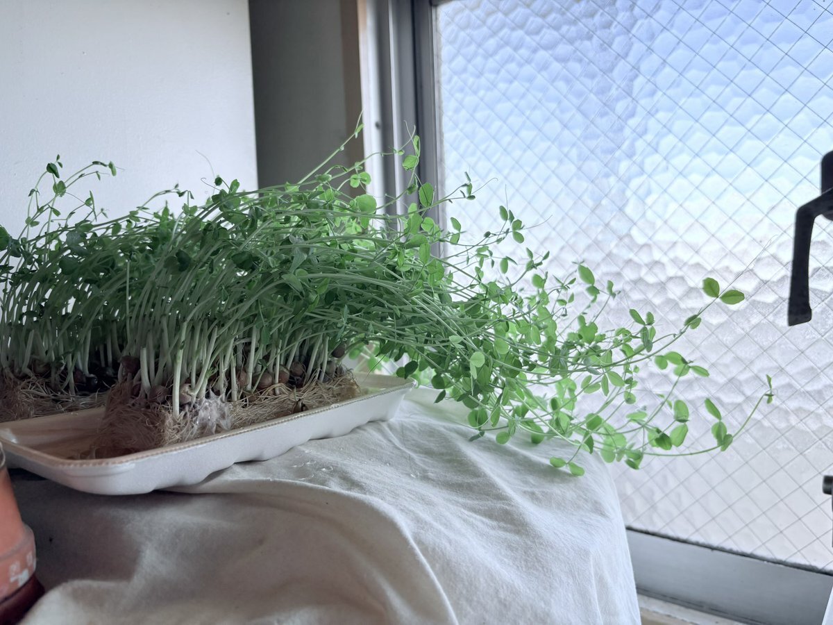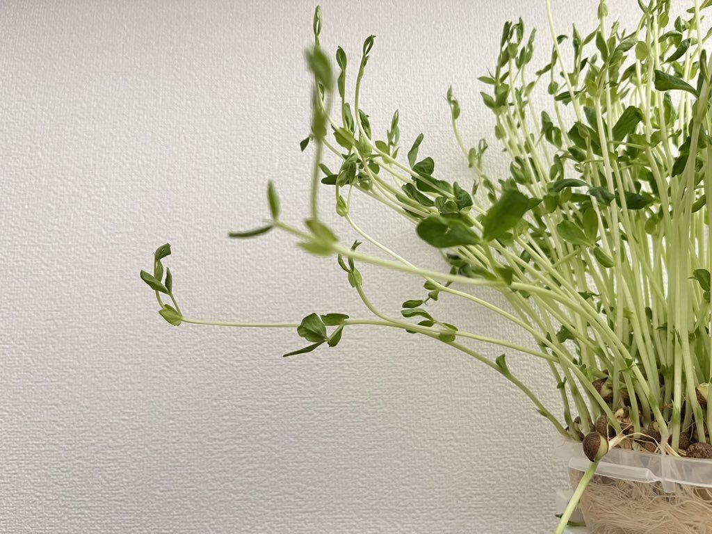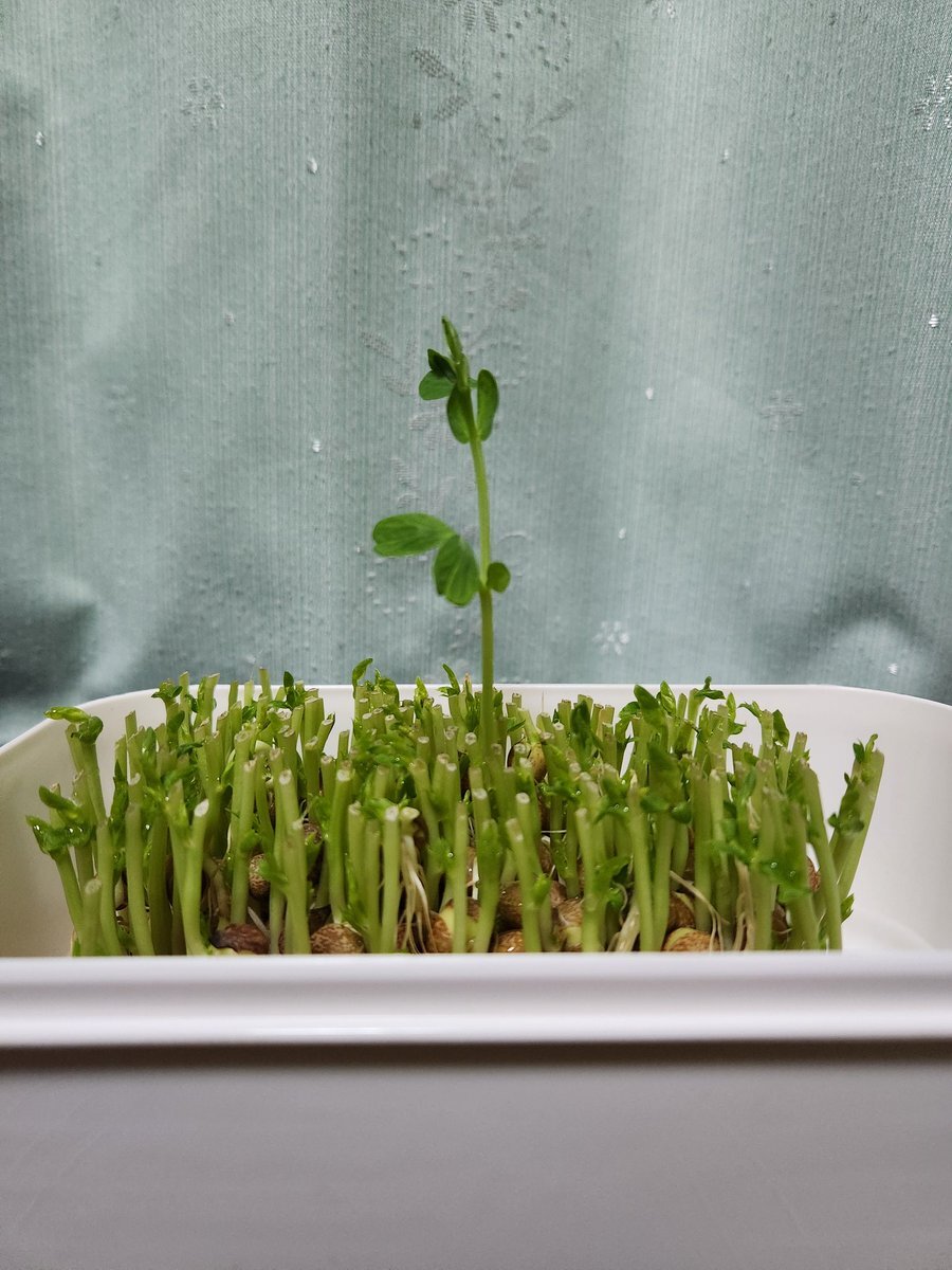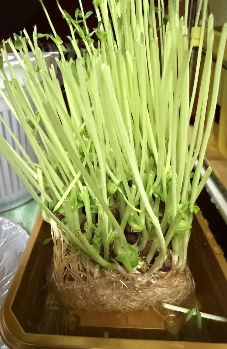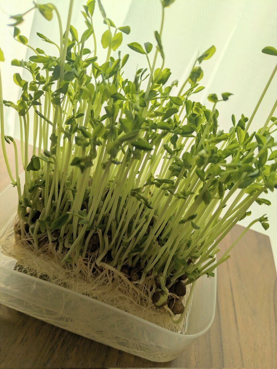先日、会社で豆苗の話で盛り上がってそのまま帰りに買って食べてみた サラダにして食べたけどシャキシャキして美味しかった🥗 そのまま次回食べるために栽培する予定だけど、切った位置が悪いのか1本だけ成長してる ちなみに写真は、食べてから(切ってから)4日目の豆苗 #豆苗 pic.x.com/f8VmZiWVSH