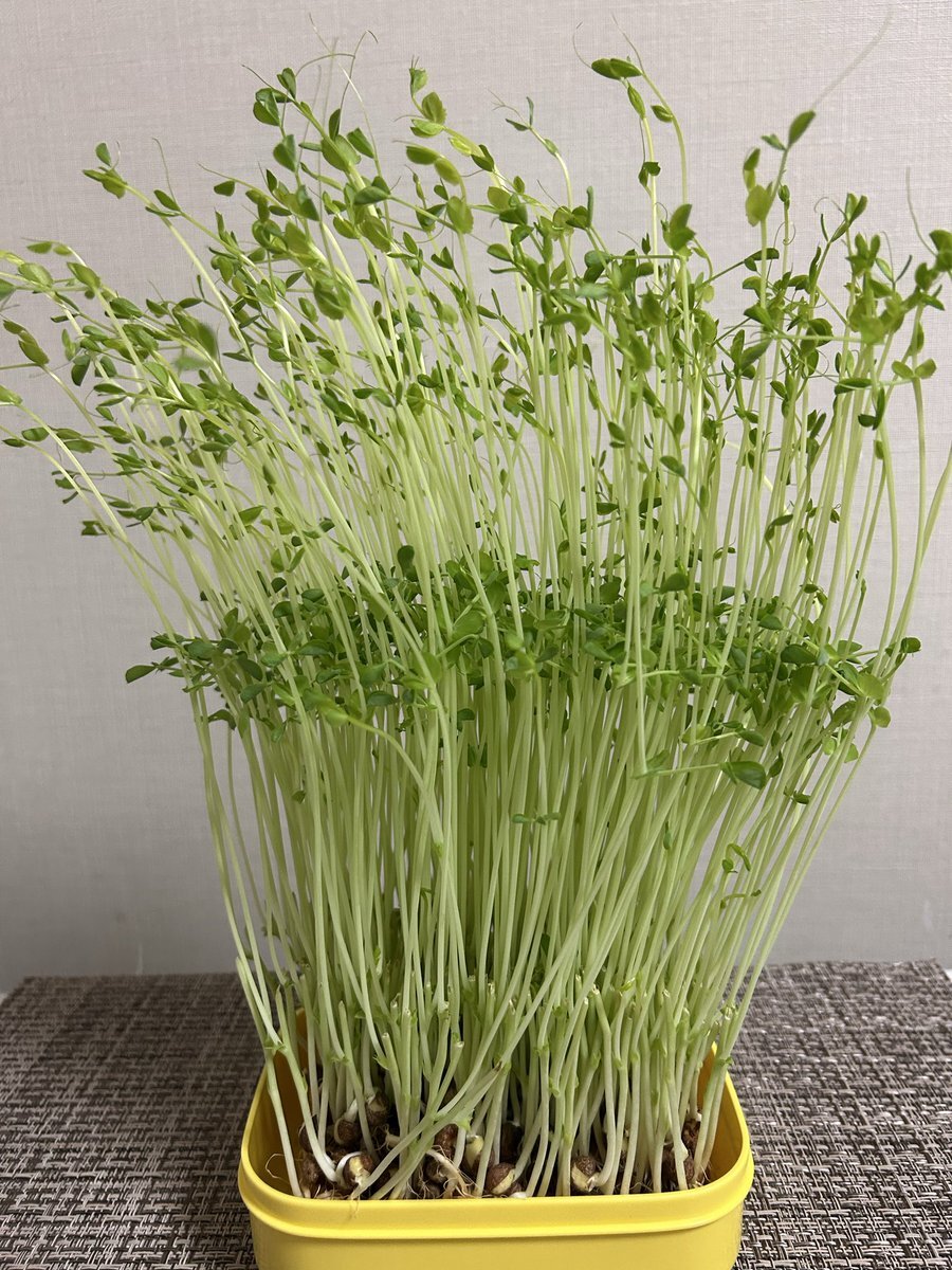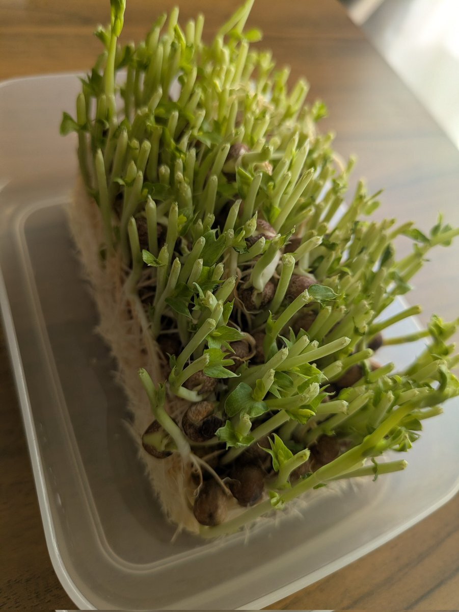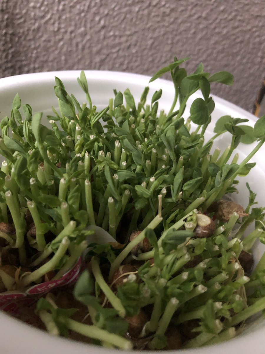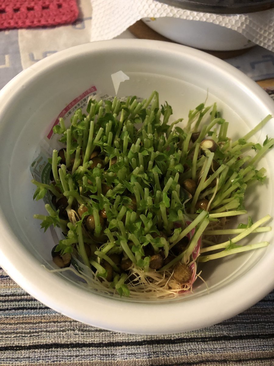 先日、会社で豆苗の話で盛り上がってそのまま帰りに買って食べてみた サラダにして食べたけどシャキシャキして美味しかった🥗 そのまま次回食べるために栽培する予定だけど、切った位置が悪いのか1本だけ成長してる ちなみに写真は、食べてから(切ってから)4日目の豆苗 #豆苗 pic.x.com/f8VmZiWVSH