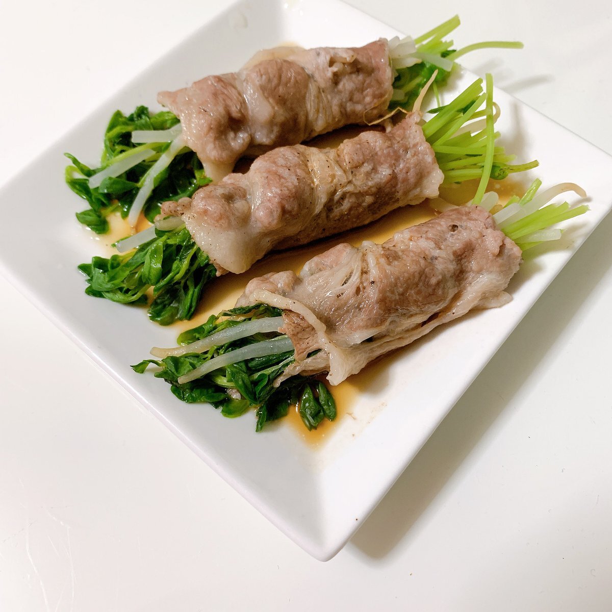 豆苗ともやしの肉巻き!! とっても美味しい😆🌱 豆苗ともやしを豚肉で巻いて、レンジで5分! ポン酢ゴマ油をかけて〜✨ 簡単♪簡単♪ 野菜がたっぷり摂れて嬉しいレシピ☺️ #豆苗 #緑黄色野菜 pic.twitter.com/tOcCKUrKnt