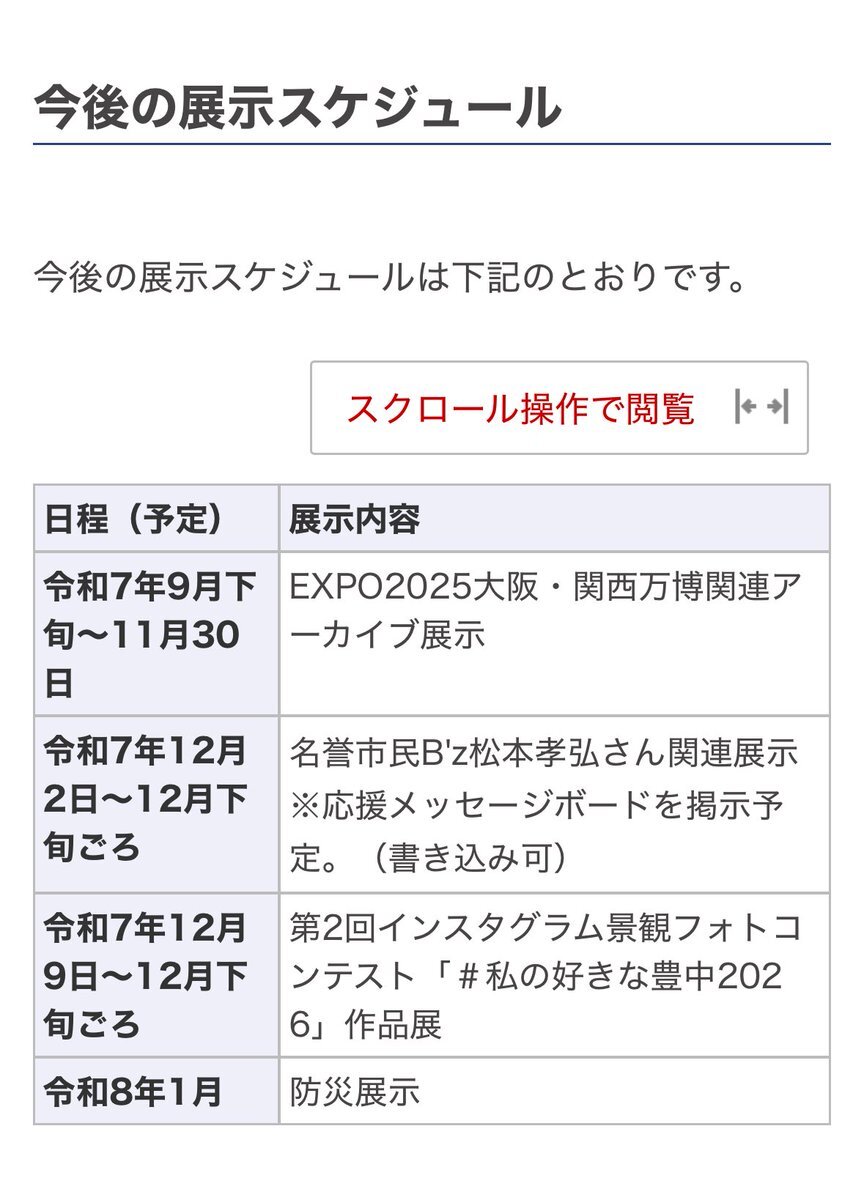 豊中駅直結の市の施設「魅力文化施設」で12月2日から名誉市民B'z松本孝弘さん関連展示と応援メッセージボードが掲示予定との事です!京セラドーム公演の際はぜひ豊中市にもお越しください!#FYOP #Bz #松本孝弘 #豊中市 city.toyonaka.osaka.jp/jinken_gakushu… pic.x.com/rAnbGvflum