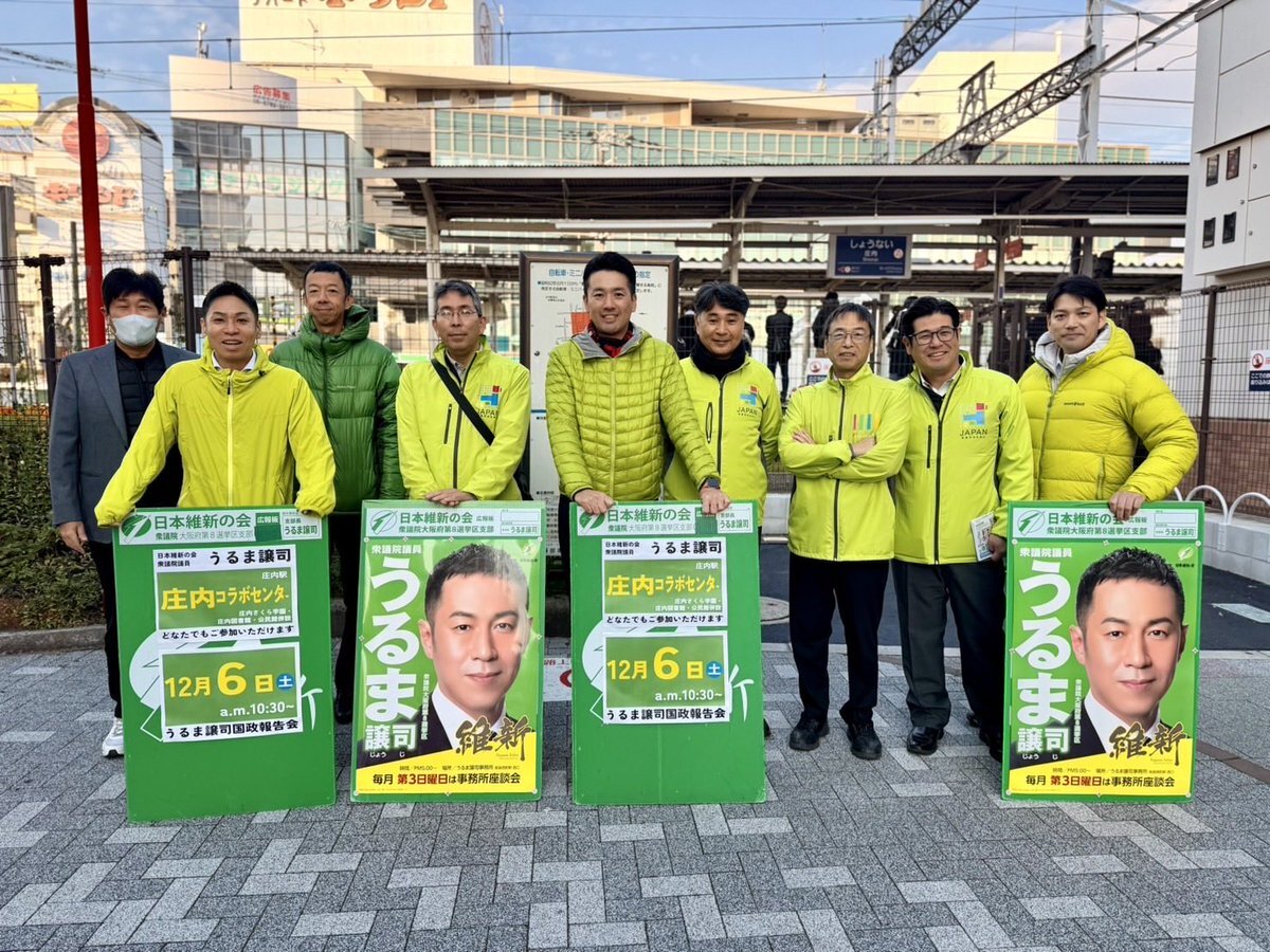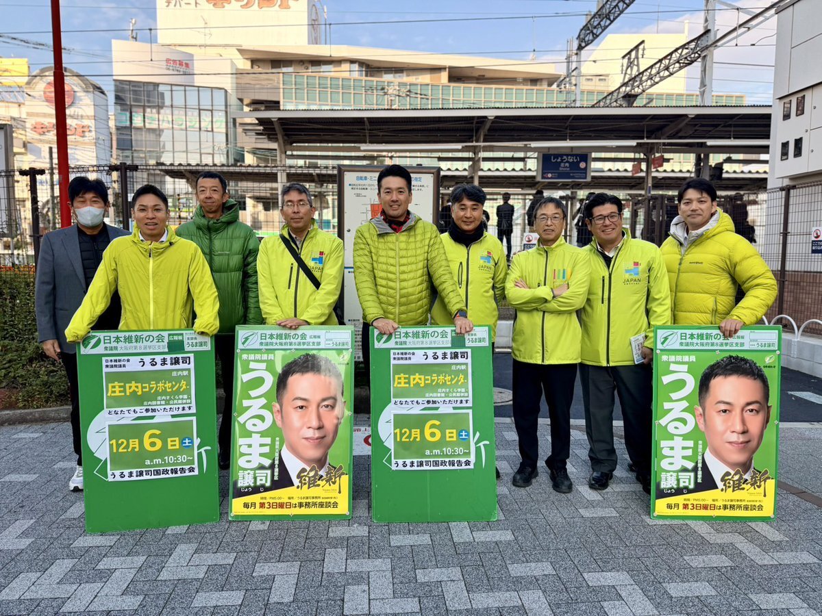 統一行動Dayを21日に行いました。 阪急庄内駅にて議員団の皆様と朝のご挨拶。朝晩の寒さが増してきておりますね!インフルエンザも流行っているようですので体調管理を大切にしご自愛下さい。 #日本維新の会 #大阪維新の会 #豊中市 #庄内 #うるま譲司 #国政報告会 pic.x.com/oT35spM2yR