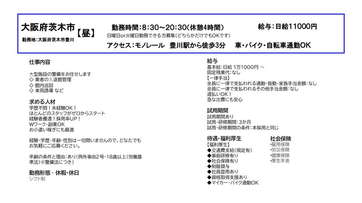 大阪府茨木市【昼勤】 日曜または火曜、両曜日勤務出来る方募集です。 #大阪 #i茨木市 #吹田市 #豊中市 #アルバイト pic.x.com/8SW8nRzF8V