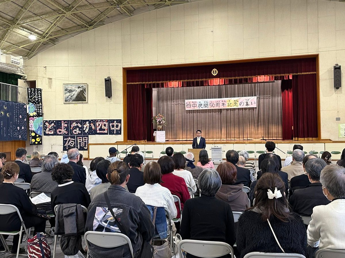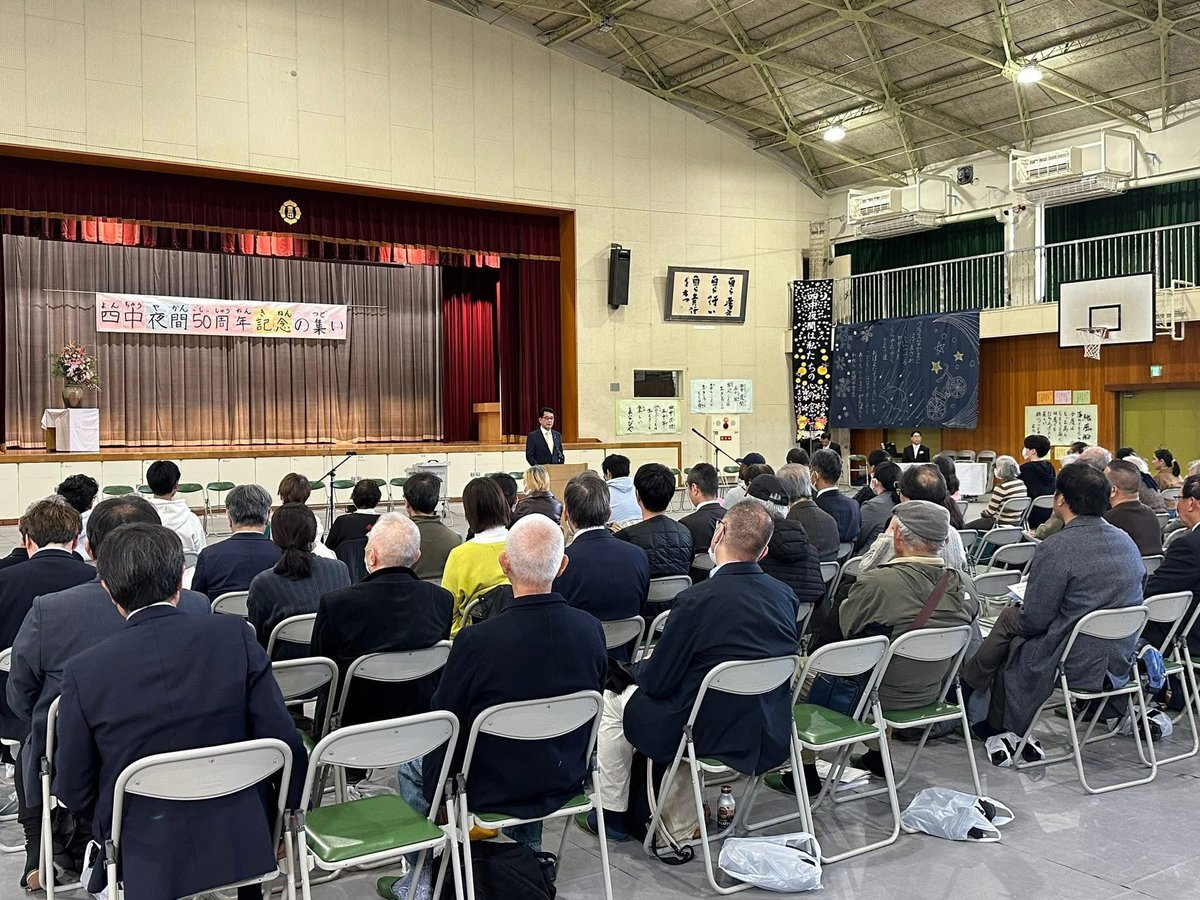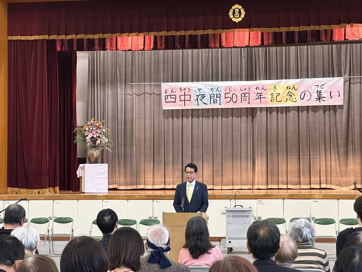 ㊗️豊中市立第四中学校夜間学級50周年🎊 北摂唯一の夜間学級として半世紀にわたり『学びたい』という思いを実現してきました。 ここで得た学びを糧に、学校に行けなかった人たちが新たな人生の扉を開くことができました。 教職員の方々の熱意と地域の皆さんのお力添えに感謝します。 #豊中市 #豊中市長 pic.x.com/nOd3mWxUux