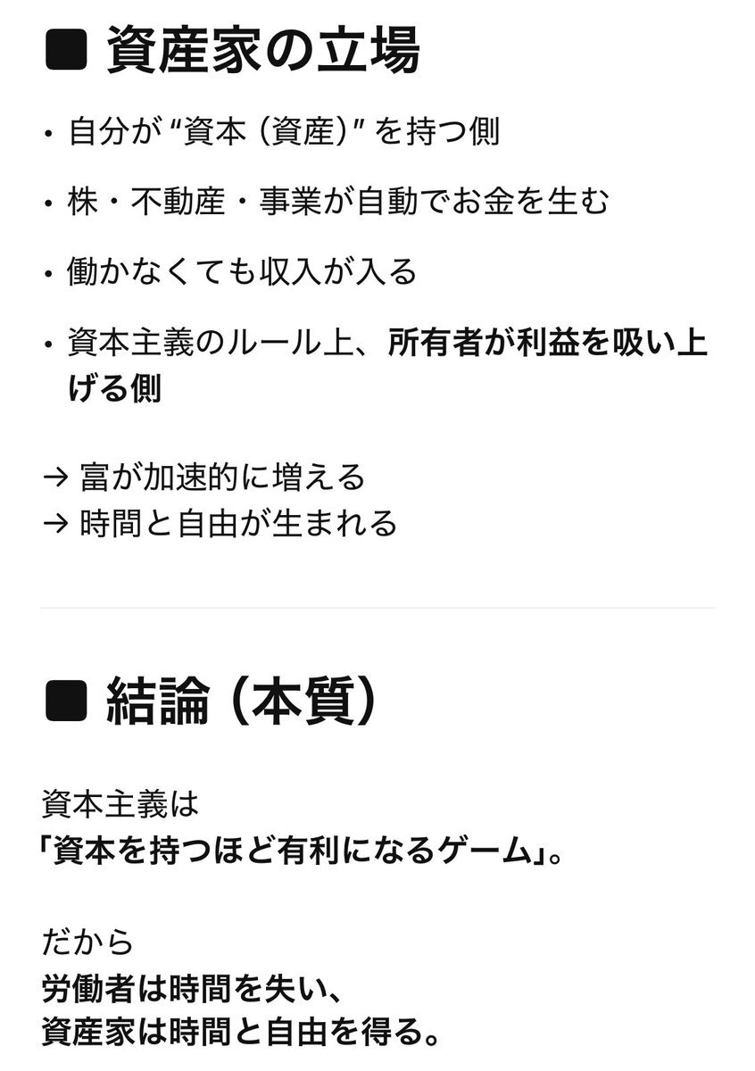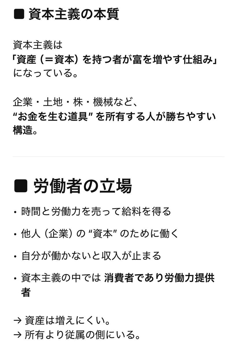 #資本主義 とは、資本(事業活動の元手となる資金や資産)を持つ者が、持たないものを支配、コントロール、利用し、富を吸い上げて飼い慣らすシステム🤖 労働者に余計なことを考えずせっせと働かせるために「労働こそ美しく、素晴らしい!」ときれいごとを並べて洗脳し、いつまでも都合よく働かせる🐴 pic.x.com/iFnP1G9F3Z