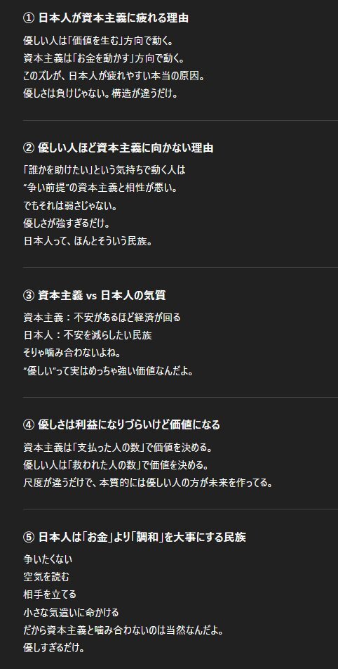 日本人が資本主義と相性が悪い理由 #資本主義 → 奪い合いゲーム #経済 → 経世済民(笑)(笑)(笑) ←最強ギャグだよ 皆が分かって資本主義が優しく去っていったらその時に 本当の 経世済民 ができるんだよ 優しい人が経世済民する時代になるから苦しかった優しい人に時代が追いつくから↓↓ pic.x.com/q1BvPnsNWO