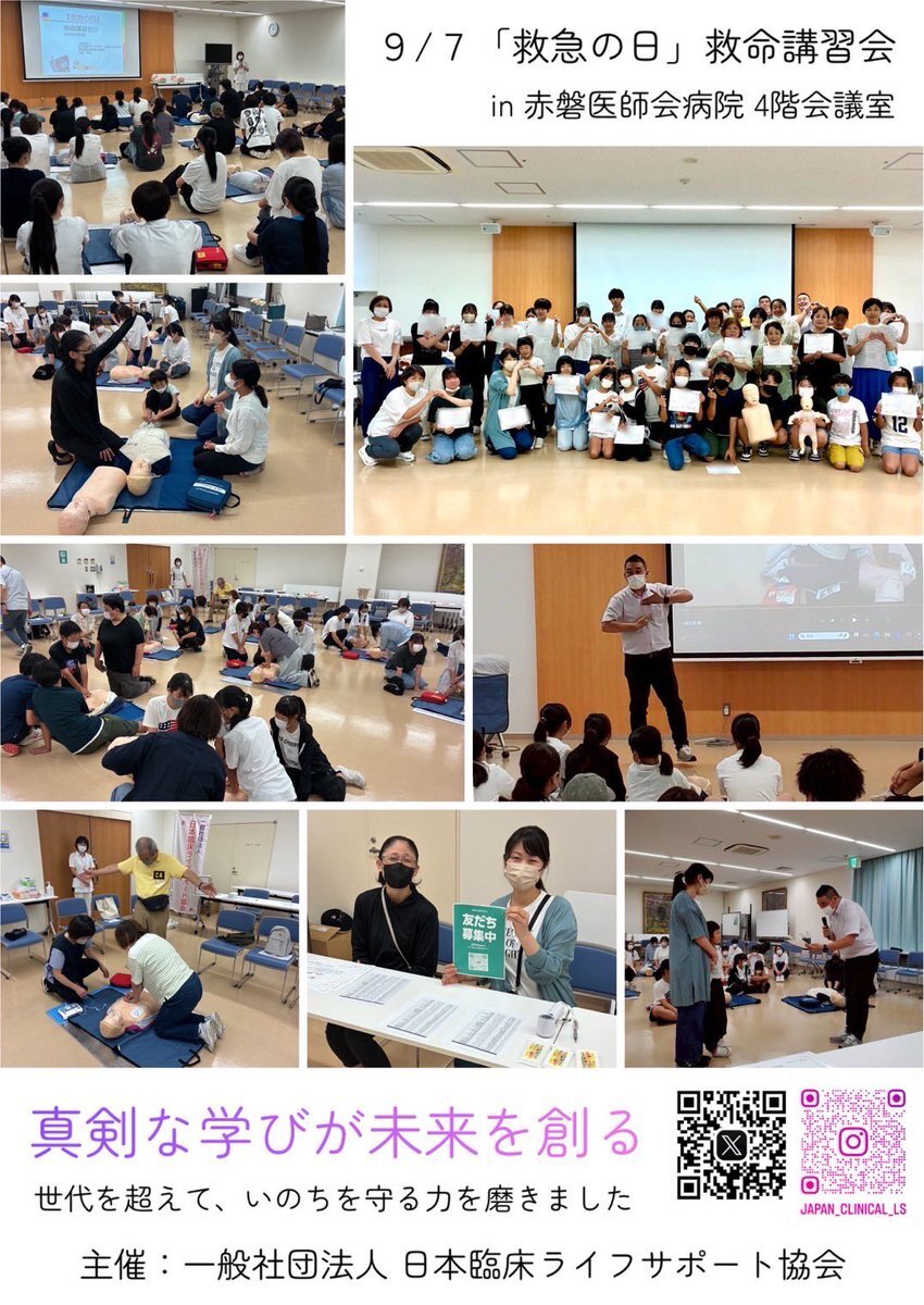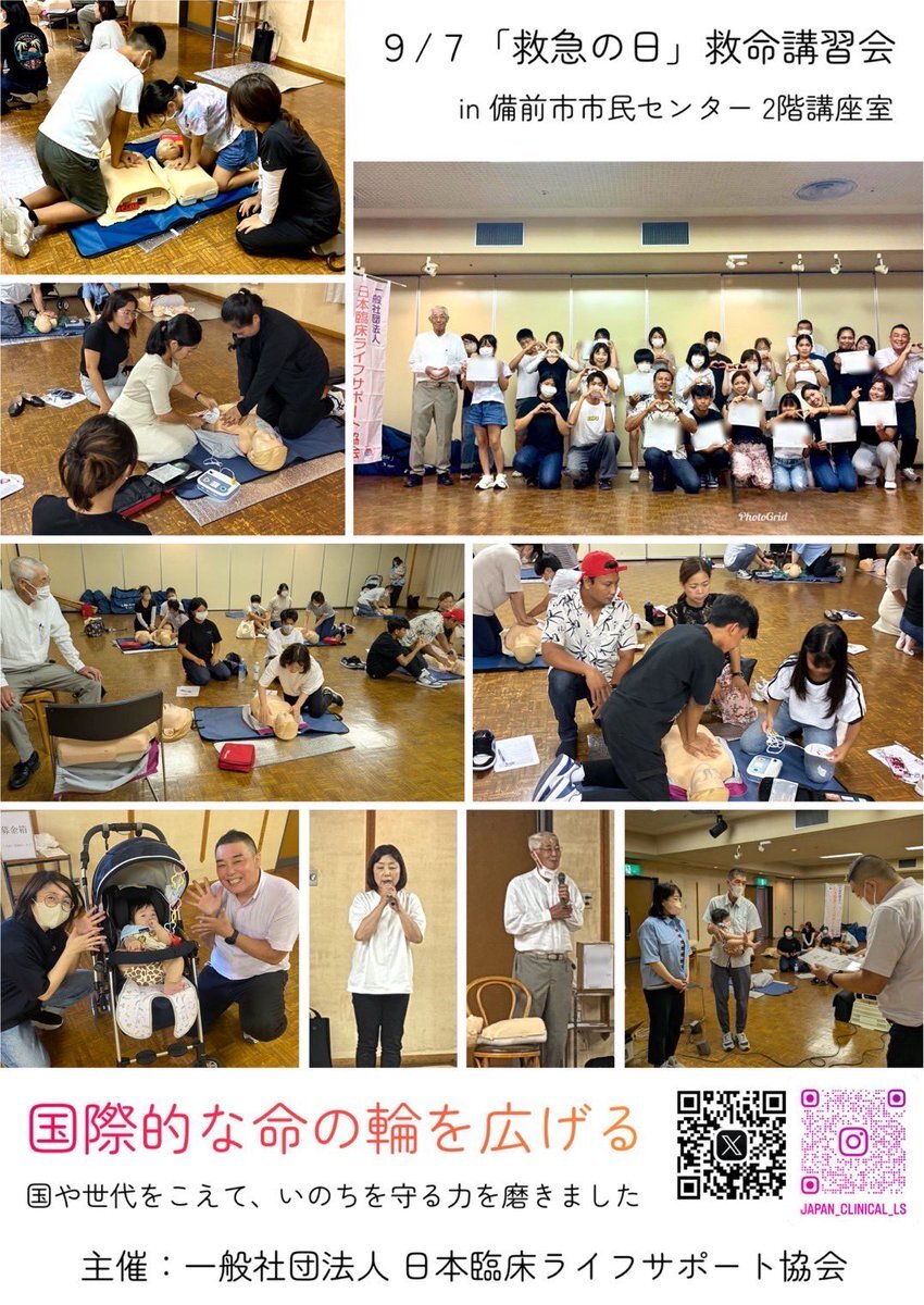9/7『 #救急の日#救命講習会#赤磐市 #備前市 #松山市 の3会場で無事終了!赤磐会場は41名、備前会場は25名にご参加。市内で勤務する海外の方や、県議や市議も参加されました。皆様ご参加ありがとうございました! 次回は12/21に開催です♪ #日本臨床ライフサポート協会 #AED #窒息対応 pic.x.com/3cVLnftKMV