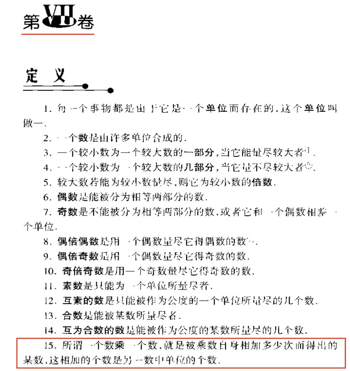 #超算数 ワイリー、李善蘭の幾何原本第7巻より #掛算|の定義が詳細な現代の訳。 兰纪正・朱恩宽译『欧几里得几何原本』第2版 西安、陕西科学技术出版社、2003 [1990] 年。cjhb.site/Files.php/Book… 15. 所谓一个数乘一个数、就是被乘数自身相加多少次而得出的某数、这相加的个数是另一数中单位的个数。 pic.x.com/EK2SG97ugf