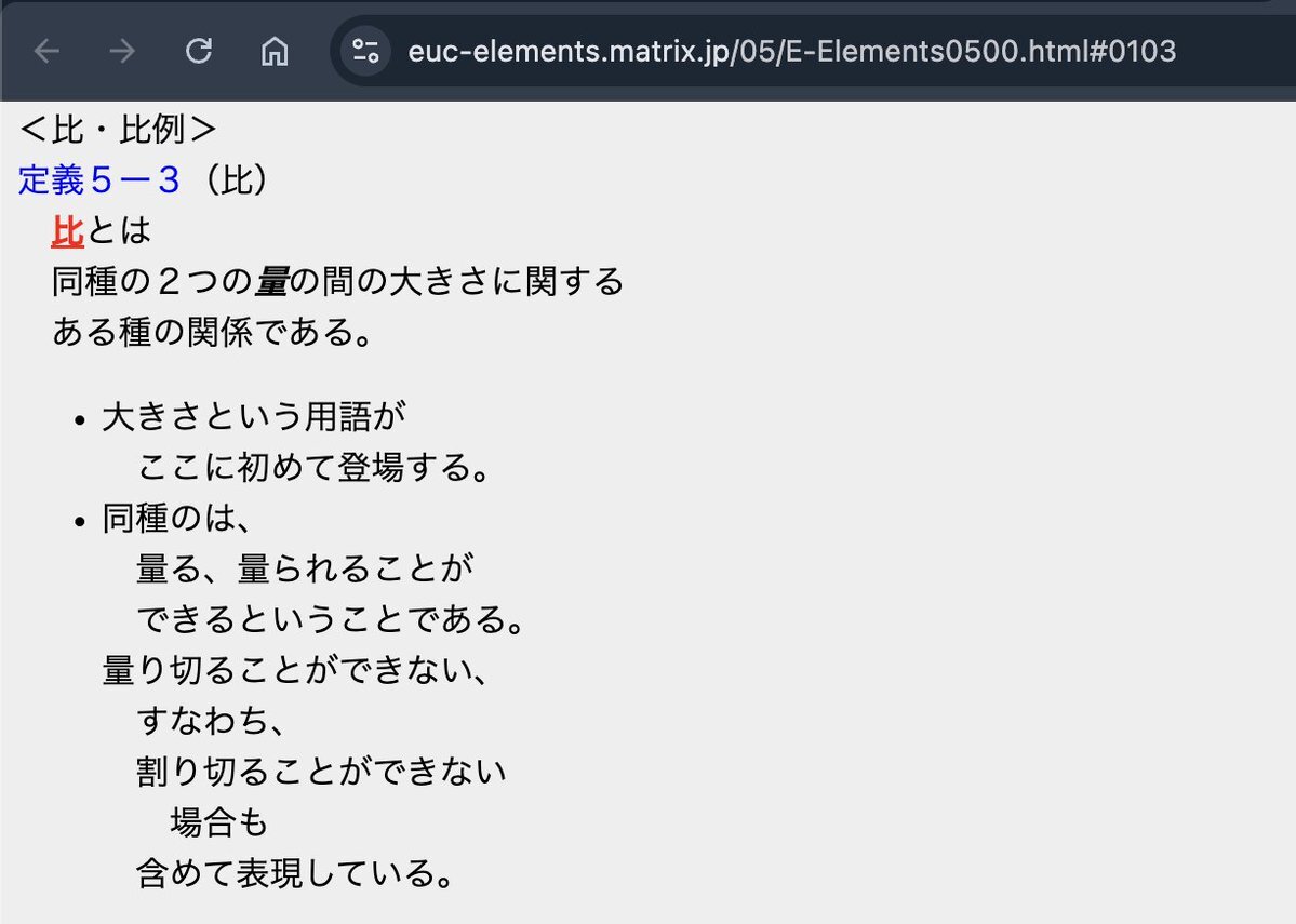 #超算数 メモ。何度かユークリッドによって異種の比が禁じられたと述べてきたが、正式に引用していなかった。原論第5巻 γ΄. Λόγος ἐστὶ δύο μεγεθῶν ὁμογενῶν ἡ κατὰ πηλικότητά ποια σχέσις. 定義5ー3(比)  比とは  同種の2つの量の間の大きさに関する  ある種の関係である。 pic.x.com/CRVI7tM8yV