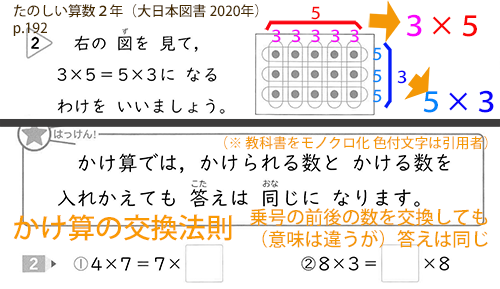 #超算数 かける数、かけられる数という語を子供に学習させねばならないのは、【教科書にその語が出てくるから】というベテラン教員。確かに2年生の教科書は、分配法則がa(b+1)に制限されたものを指導し、かけ算でかける数が1増えると、答えはかけられる数だけ大きくなるのような表現を与えている。 x.com/piccolinopico/…