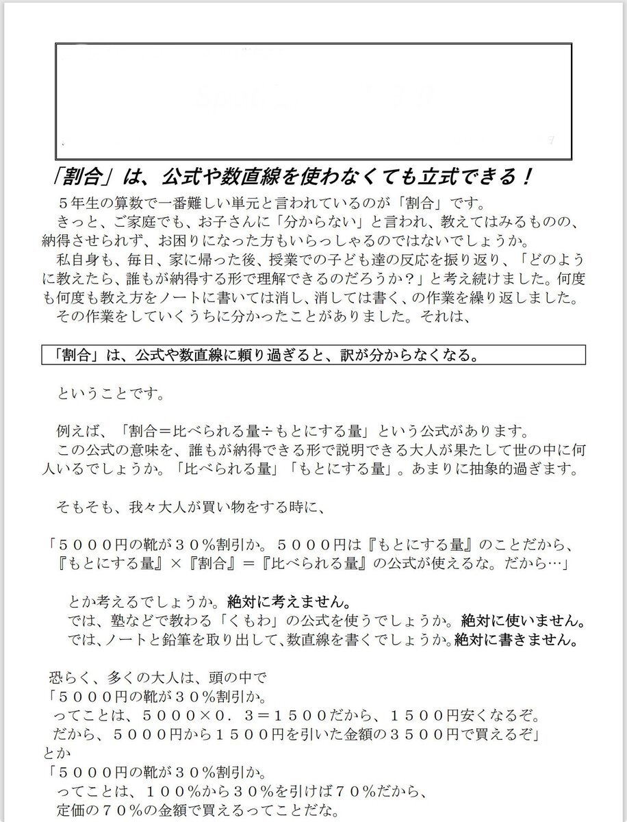 【割合は公式や数直線を使わなくても立式できる】 教員生活5年目のとき、初めて5年生を受け持ちました。 その頃の学級通信にて、「算数における割合の求め方」について載せたことがありました。 結構好評で、以来 私は毎回、この方式で教えています。 どこかの誰かの参考になったら幸いです。