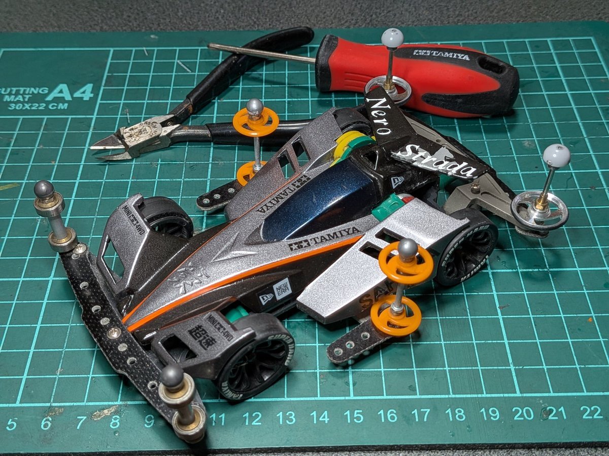 超速GP再現なシャイニングスコーピオンほぼ完成٩( 'ω' )و 作り始めとだいぶ印象が変わってて不思議な感じ。サイドローラー付けられないのがちょっと惜しい(´⊙ω⊙`) #ミニ四駆 #超速GP pic.x.com/NtyLMeFfyL x.com/kumapen1111/st…