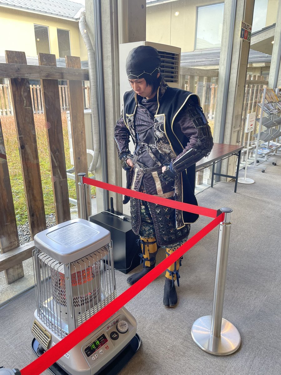 本陣の ひいたあ にて暖を取る景勝様 この ひいたあ という現代の火鉢はとても暖かく誠に素晴らしきもの!! 長親も ひいたあ の前から離れ難い日が続いております #越後上越上杉おもてなし武将隊 #上越市埋蔵文化財センター pic.x.com/HMlB8GDE9f