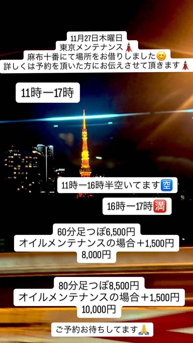 🗼東京メンテナンス 11月27日木曜日 今回は新宿区早稲田ではなく シュハリの場所を借ります. 麻布十番にある施術部屋〜 スポットではありますが東京メンテナンス行きます! 予約はメッセージにてお待ちしてます🙏😊 #身体メンテナンス #足つぼ #オイルメンテナンス #麻布十番 #東京メンテナンス pic.x.com/JlxDGjV2Oy