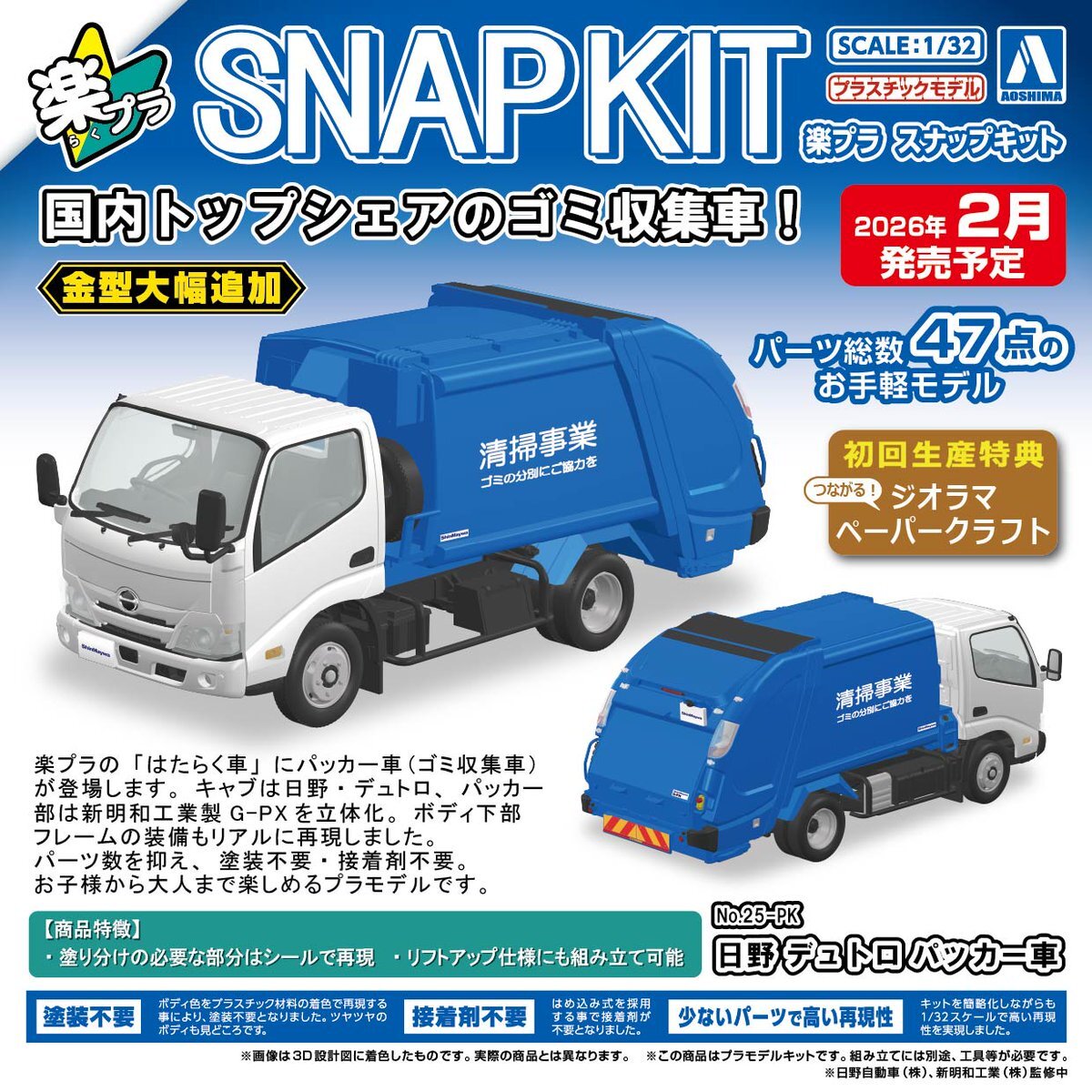 🍎新製品受注スタート🍎 楽プラ スナップキット No.25-PK 日野 デュトロ パッカー車 2026年2月発売予定❣ 詳しくはこちら(*´・д・)σ aoshima-bk.co.jp/product/490508… #アオシマ #プラモデル #車 #楽プラ pic.x.com/htMnzcLw3A