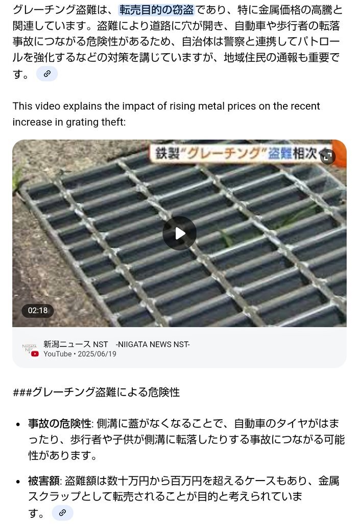 最近グレーチングの盗難が 多発しているそうですよ💥 この事件を聞くまでコレを グレーチングという事自体 知りませんでした😂 #盗難 やはり外国人の仕業かな⁉️ #グレーチング #移民反対 #鉄 #転売 #移民政策反対 pic.x.com/cgk3iK4dRv x.com/iijNWqUQ7i4163…