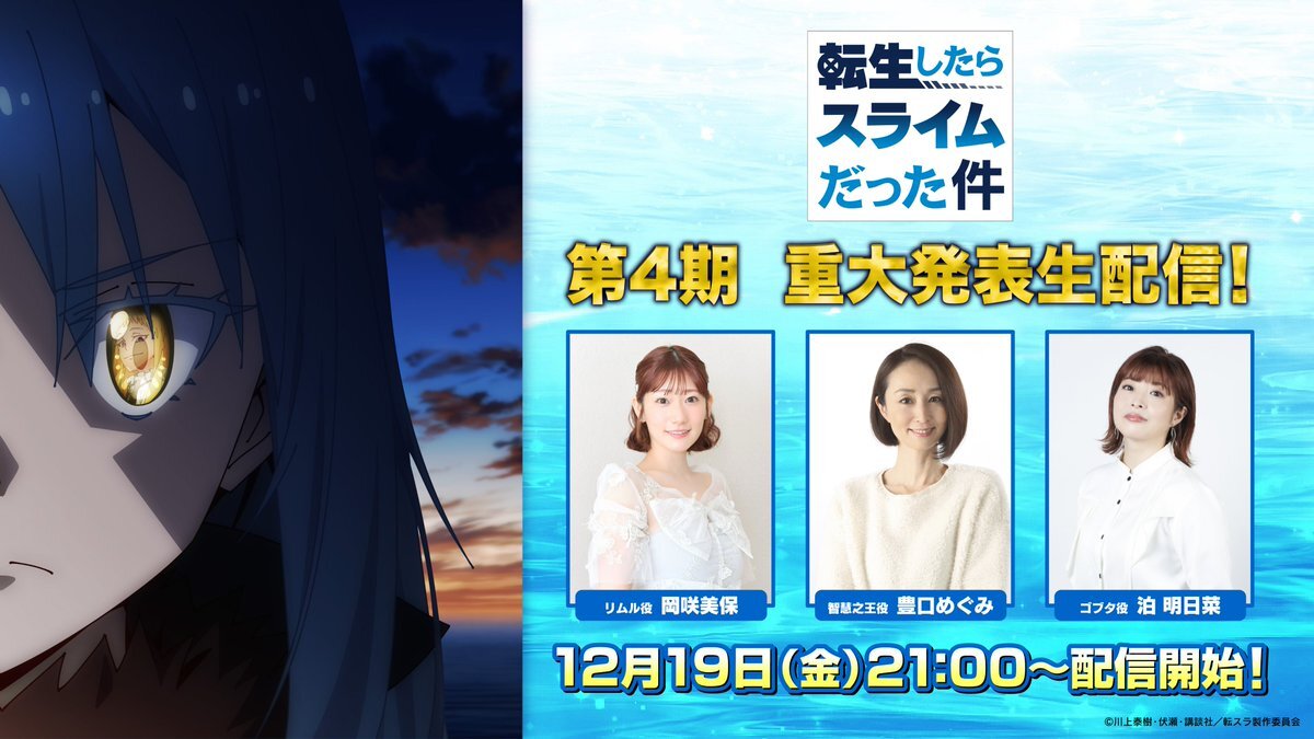 // TVアニメ『転生したらスライムだった件』第4期 重大発表生配信 実施決定! \\ 【出演者】 #岡咲美保 (リムル役)、#豊口めぐみ(智慧之王役)、#泊明日菜(ゴブタ役) 【日時】12月19日 21時~ 【配信】Youtube・Xライブ その名の通り『第4期』の新情報を発表!