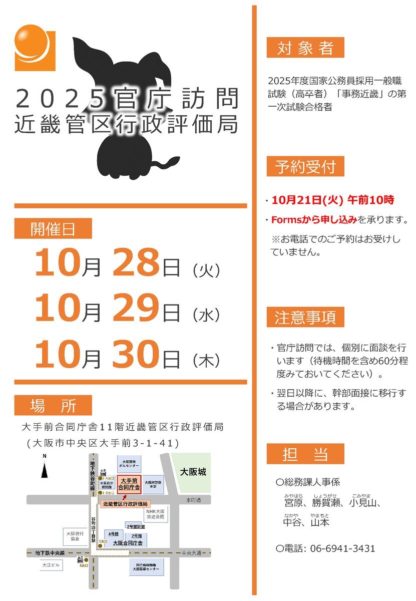 【国家公務員一般職(高卒者試験)採用情報】 近畿管区行政評価局では、R8年度採用(1名)に向け、官庁訪問を10月28日、29日、30日に行います。受付はForms(申込フォーム)から、明日21日(火)午前10時から開始します。#官庁訪問 #高卒 #近畿 #就活 詳細→soumu.go.jp/kanku/kinki/ki… pic.x.com/huUOsZLN2N