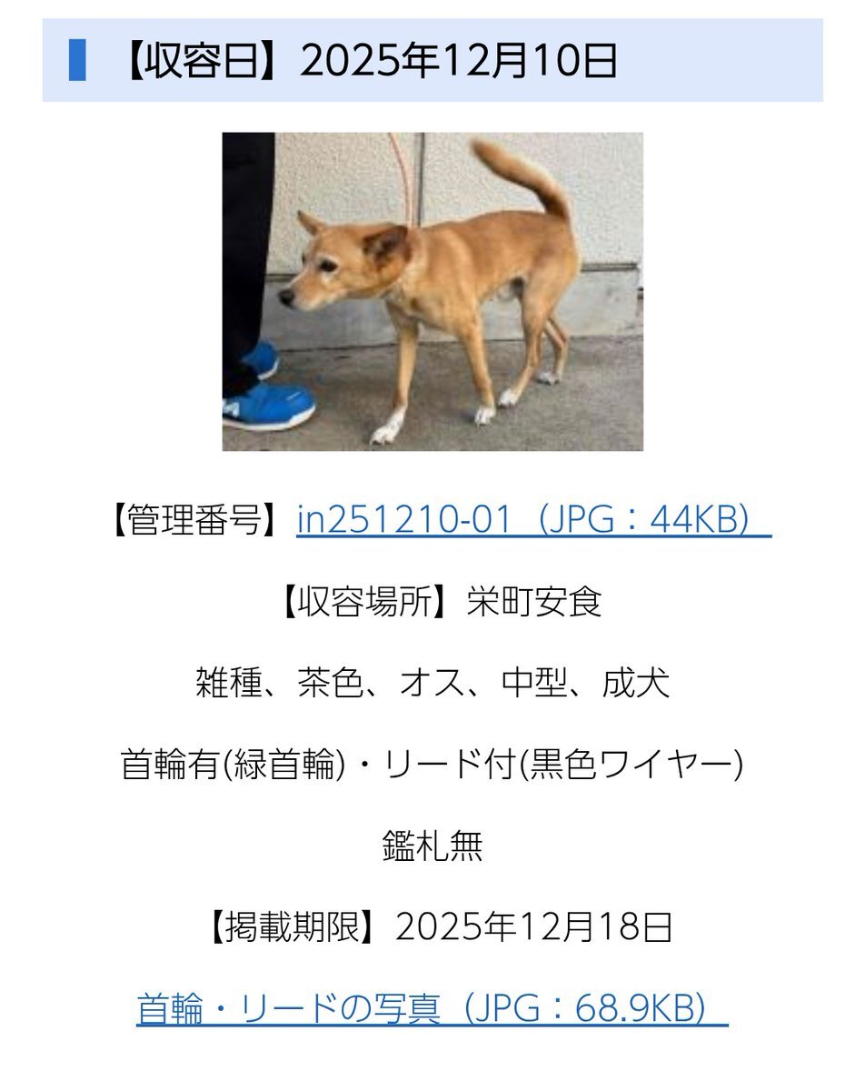 まだお迎えないようです 千葉県のみならず他県の方も確認を #迷子犬 #迷い犬 12/10 #千葉県 #千葉県迷子犬 #栄町 #安食 #印旛郡 #雑種犬 オス 茶 📍緑色首輪 📍黒色ワイヤーリード お心当たりある方はセンターまで 🔴連絡先🔴 #千葉県動物愛護センター 本所 ☎0476-93-5711 pic.x.com/TIUy487tuV x.com/CLASSICLETSFOL…