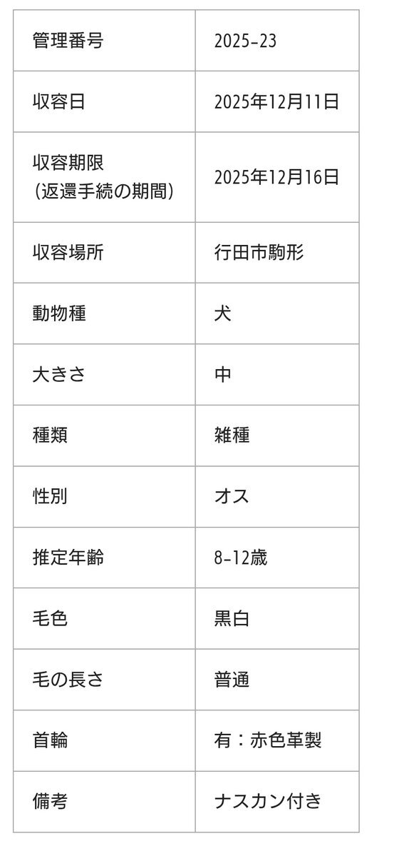 拡散希望📣📣📣 #迷子犬 #迷い犬 12/11 #埼玉県 #埼玉県迷子犬 #行田市 #駒形 保護 #行田市迷子犬 #雑種犬 オス 黒白 #黒柴 風 📍革製赤色首輪 📍ナスカン付き 📍推定8歳〜12歳 お心当たりある方は保健所まで 行田市 加須市 羽生市 🔴連絡先🔴 #加須保健所 ☎0480-61-1216 pref.saitama.lg.jp/b0709/syuuyouj…