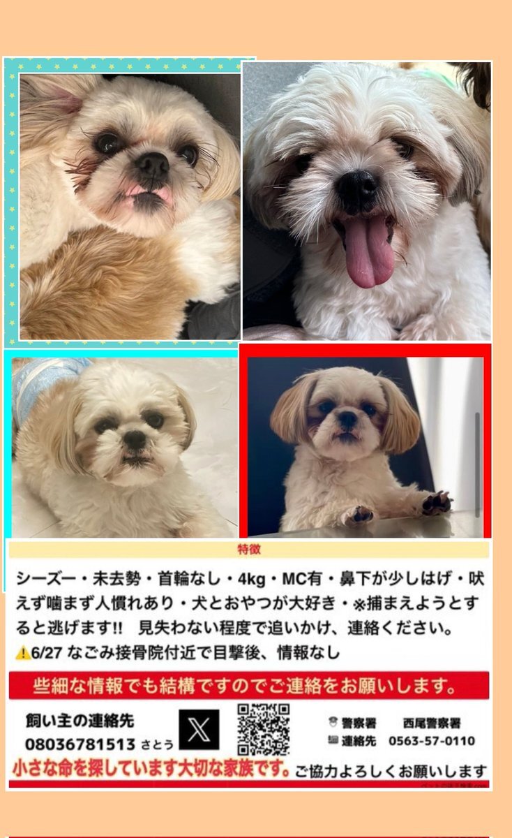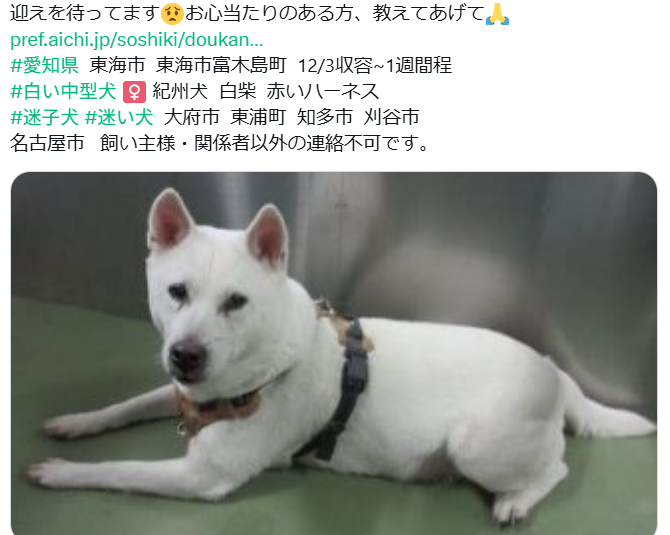 この子を見かけた方いませんか? 些細な事でも構いませんので何か情報がありましたらご連絡お願いします 見かけた際は早急に警察か飼い主へ連絡し来てもらって下さい 保護に来るまで時間が許す限り見失わないようお願いします 寒さ事故など心配 #愛知県東海市 #東海市 #東海 #拡散希望 #迷い犬 #迷子 x.com/gy2tiubn6e8e6k…