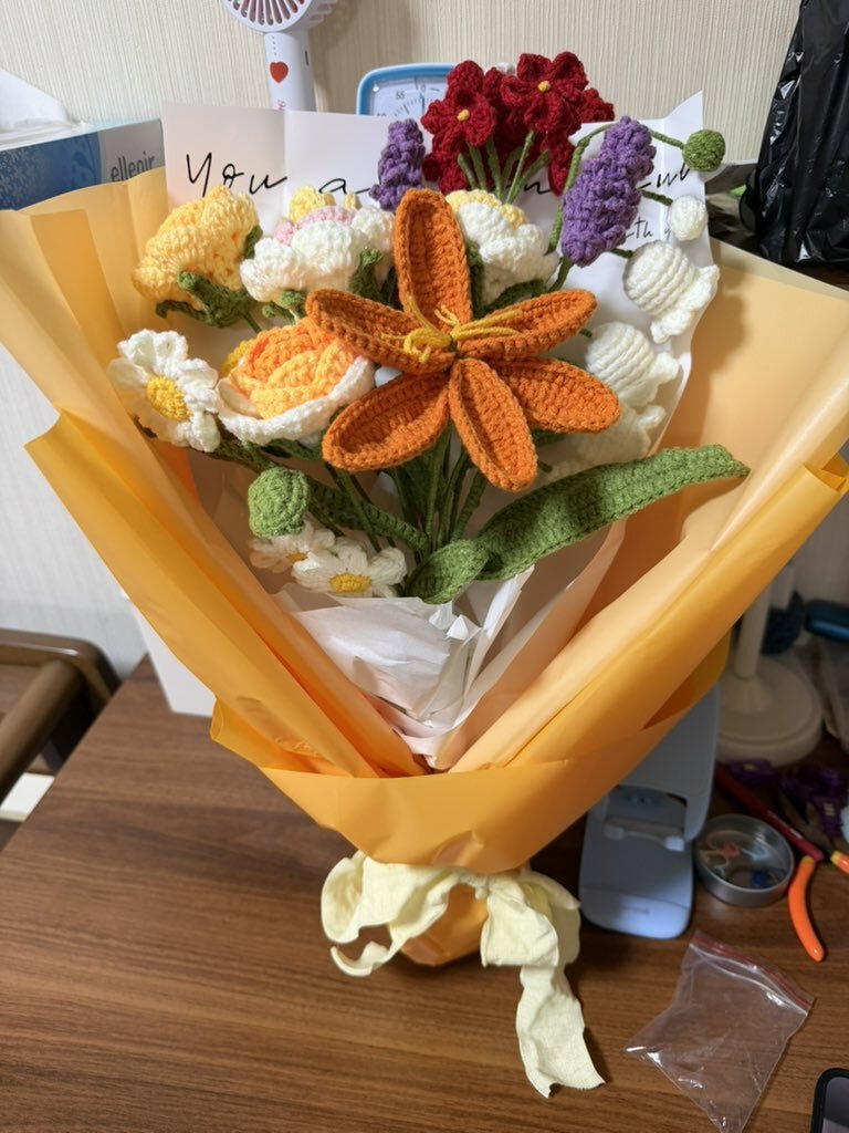 キットを購入して初めて作ってみました 不器用すぎて包装紙が上手に巻けません笑 #編み物 #編み物好きさんと繋がりたい #かぎ針編み #ハンドメイド #ハンドメイド好きさんと繋がりたい #花束 #造花 pic.x.com/NeMvI1G8Ub