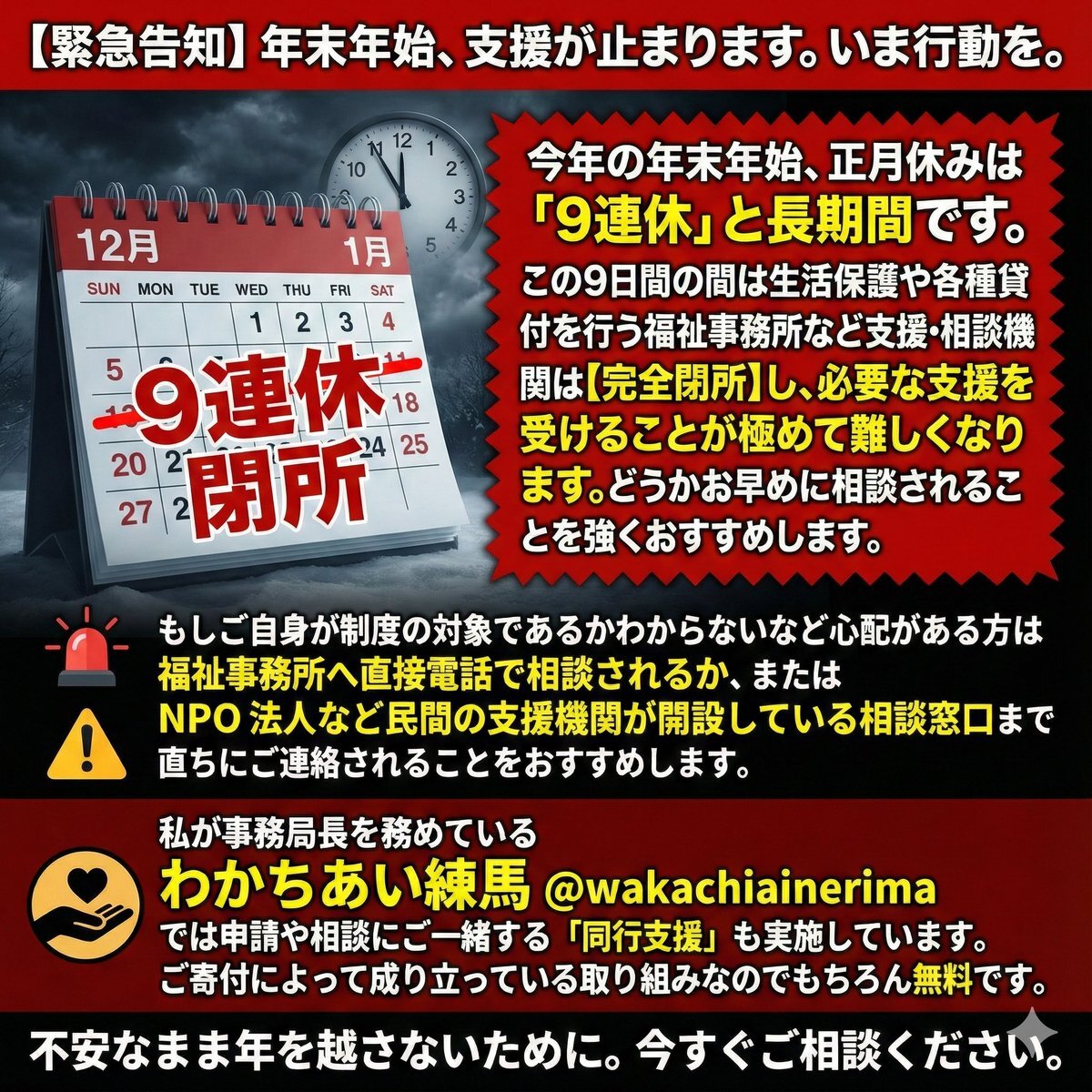 「年を越せるか不安…」そう思っていませんか? 今年の #年末年始 は、支援の窓口が9日間も閉まってしまいます。 不安なまま #連休 に入るのは避けてください。 一人で役所に行くのが怖い、制度が分からないという方も大丈夫です。私たちが無料で一緒に申請や相談に行きます。 pic.x.com/QGqrGT0F7Y
