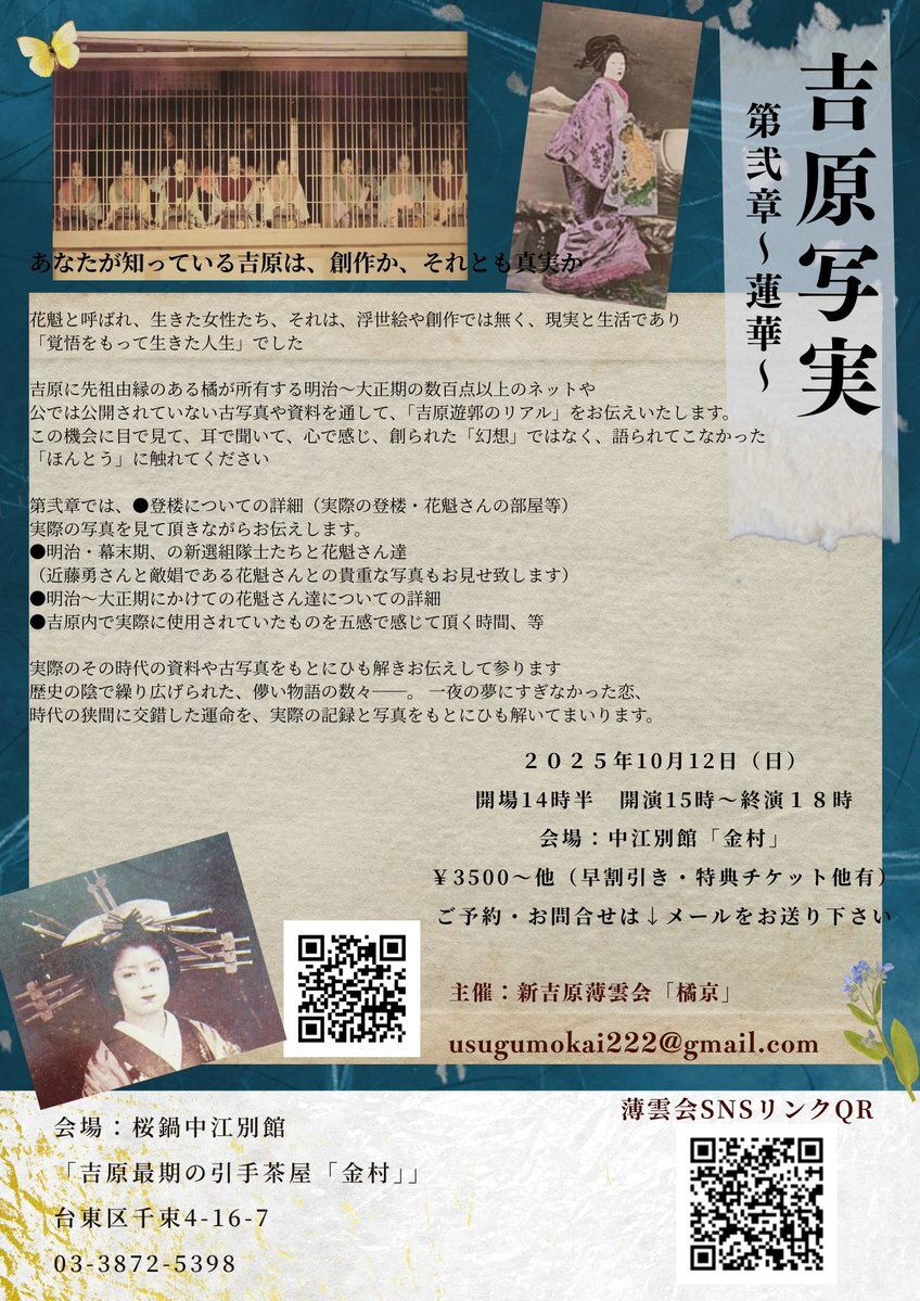 残席僅かですが、まだ大丈夫です! 当日券もございます。 ご参加希望の方は直接DMかメールをお送りくださいませ、宜しくお願い致します。 #吉原遊廓 #大河べらぼう #吉原細見 #横浜流星 #吉原遊廓 #べらぼう #花魁 #べらぼう蔦重栄華乃夢噺 #新吉原 #吉原遊郭 #明治 #大正 #娼妓 #遊女 #遊廓 #遊郭 x.com/yoshiwara2222/…