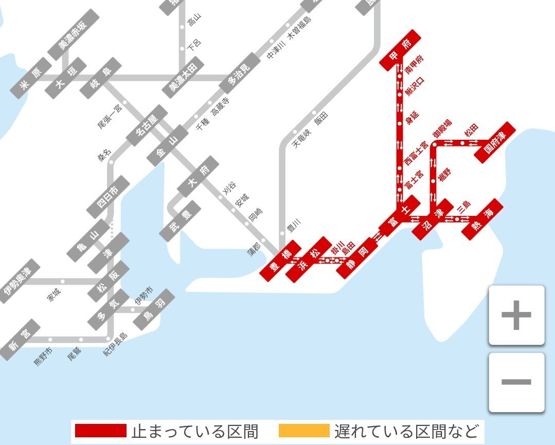 【#運行情報 #運転見合わせ 】 線路設備確認及び車両確認のため、静岡県内を走るJR東海管内の飯田線を除く全ての区間で運転を見合わせています。 【運転見合わせ区間】 東海道線:熱海〜豊橋駅間 (正午頃まで) 身延線:全線 (7時頃迄) 御殿場線:全線 (7時頃迄) pic.x.com/Jhs0JNiMxc