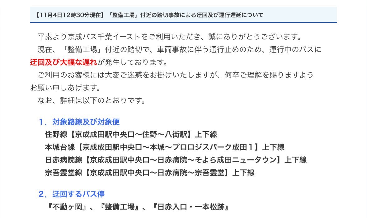 この事故により 京成バス千葉イーストの下記の路線に、迂回による大幅な遅延が発生しています。 #鉄道運行情報 #京成バス千葉イースト #運行情報 #成田市 #富里市 pic.x.com/ZCNzRJMuP0 x.com/j_fukumine/sta…