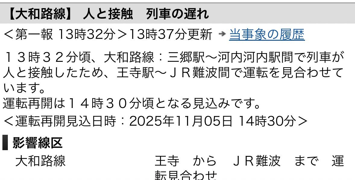 【11/06,20:04現在】 遅れのお知らせ 「のぞみ87号」が、品川駅発車時に非常停止ボタンが扱われたため、ホーム上の安全確認を行いました。この影響により遅れが発生しています。各列車の遅れ時分などの詳細は、「個別列車案内」でご確認ください。 #新幹線 #運行情報 traininfo.jr-central.co.jp/shinkansen/sp/…