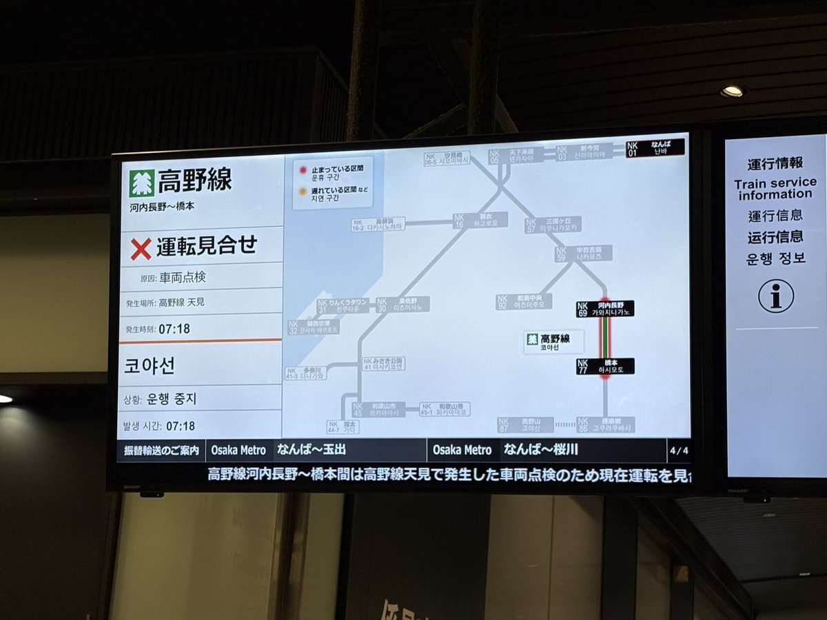 07時18分頃、天見で発生した車両点検のため、河内長野~橋本間で現在運転を見合せております。振替輸送を実施しております。 振替輸送も実施中です! traffic.nankai.co.jp/railinfo/01.ht… #運行情報 #高野線 #電車 #遅延 pic.x.com/53qFpJQPVs
