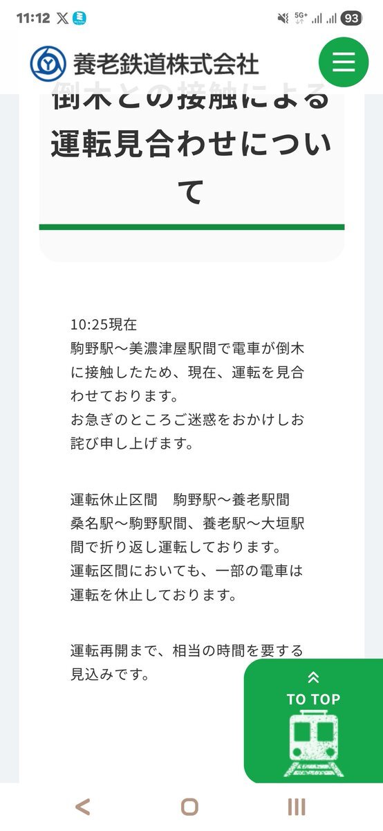 悲報! 養鉄 倒木接触で運転見合わせ! 駒野~美濃津屋 該当列車は走行不能とのこと、運転再開にわ 大幅に時間がかかる模様とのこと。長期の運転見合わせ可能性高い! #養老鉄道株式会社 #養老鉄道 #運転見合わせ #鉄道 #地方ローカル線 pic.x.com/STm5gjCltJ