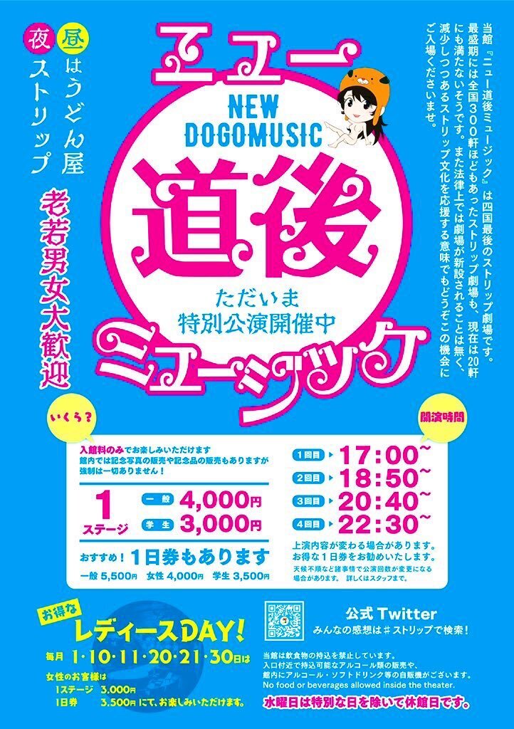 【11/15(土)の公演】  ①千代田彦②琴音みおん③夢乃うさぎ 温泉の似合う季節になってきました! どうぞ楽しい週末をお過ごしください。 うどん釜爺は本日11時半より営業いたします #うどん #ストリップ #道後 pic.x.com/m1MEEOFS6r