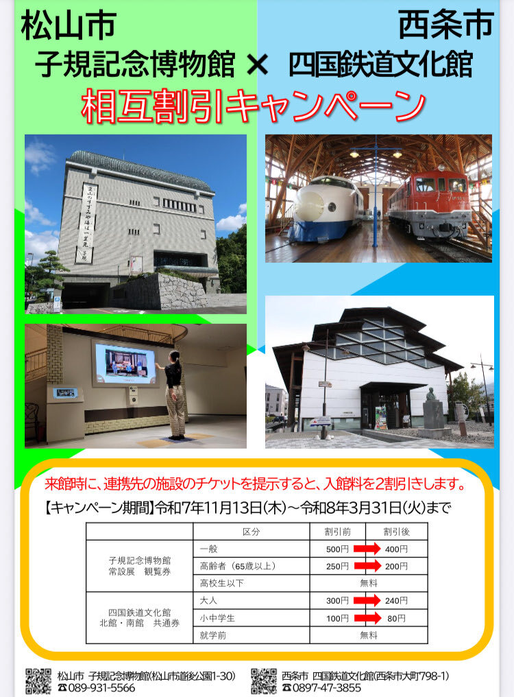 #子規博 #松山 #道後 #正岡子規 #西条市 #四国鉄道文化館 #鉄道 #割引 いよいよ秋も深まって、旅に最高の季節じゃなぁ。 あしも、鉄道文化に触れる旅をしたいと思うとったら、えぇ話を聞いたんよ! 11月13日から、子規博と鉄道文化館の両方をお得に観覧できるぞな✨ city.matsuyama.ehime.jp/hodo/202511/sa… pic.x.com/TK1lld36D9