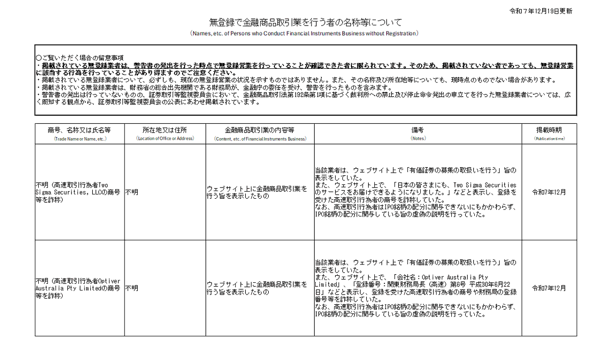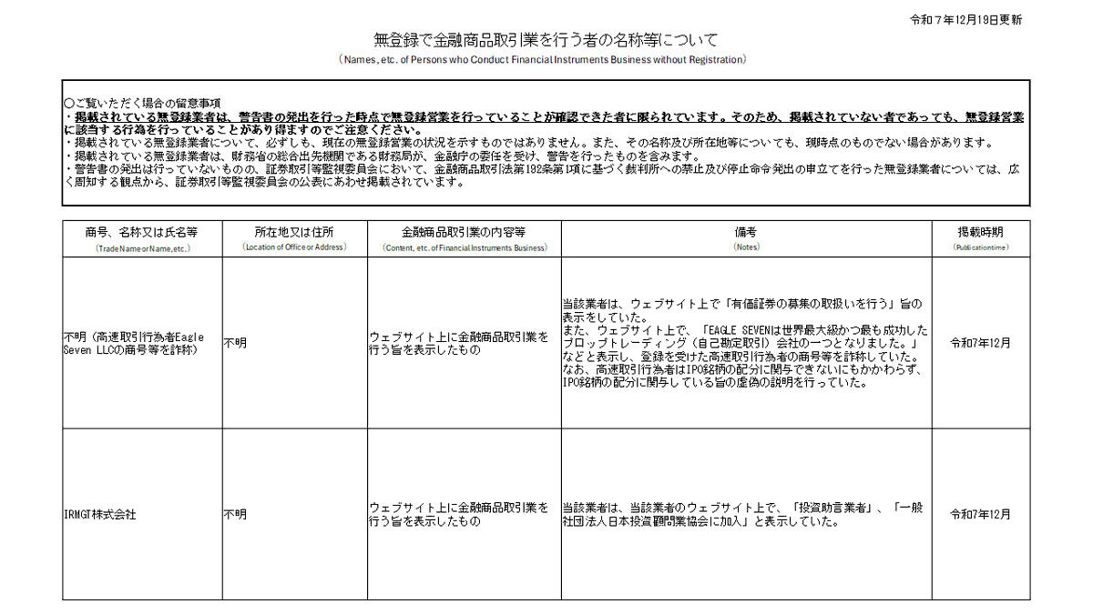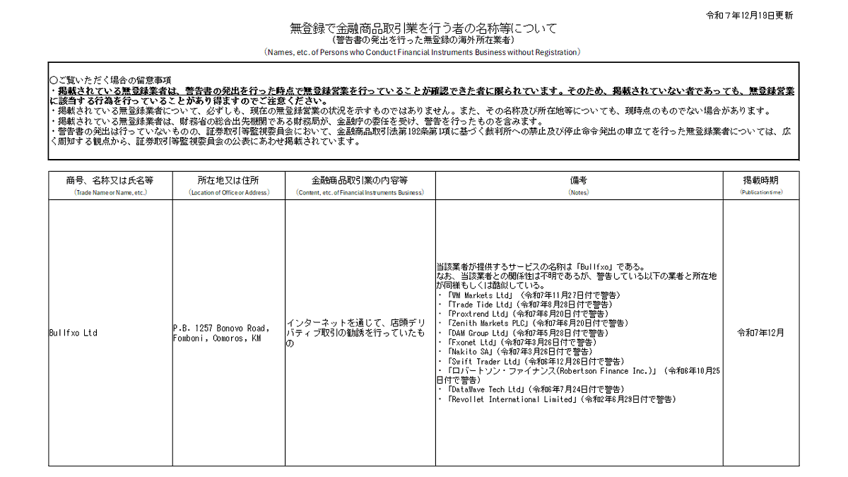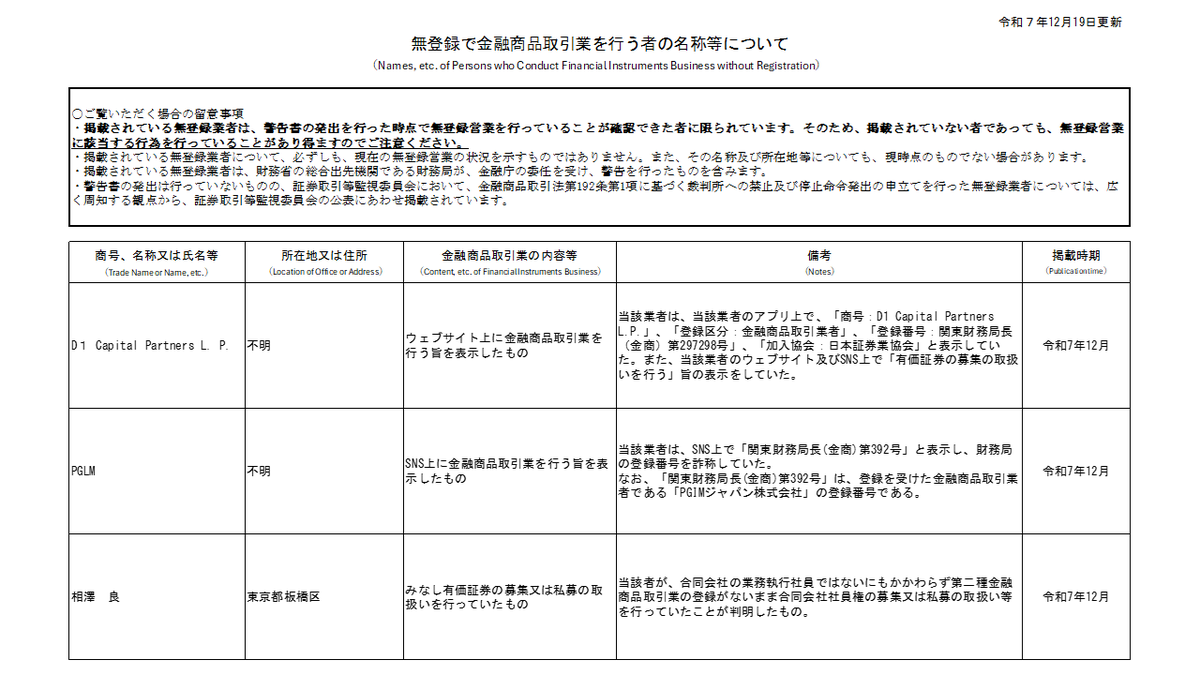 「無登録で金融商品取引業を行う者の名称等」を更新しました。 #無登録 で #店頭デリバティブ取引 を行う業者と取引し、出金できなくなるなどの事例もありますのでご注意ください。 fsa.go.jp/ordinary/chuui… #IRMGT #Bullfxo #PGLM #違法 pic.x.com/PvoC7tt95n