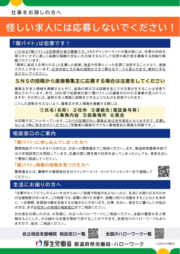 ★仕事をお探しの方へ★ ●『闇バイト』は犯罪実行者の募集で、仕事でなく犯罪です。 『闇バイト』に関わらないために、以下の文言に注意し、応募しないでください。 【怪しい文言】 ・即日即金 ・高額報酬 ・ホワイト案件 等 ●相談は「警察相談ダイヤル#9110」まで! #闇バイト x.com/MPD_tokuryu/st…