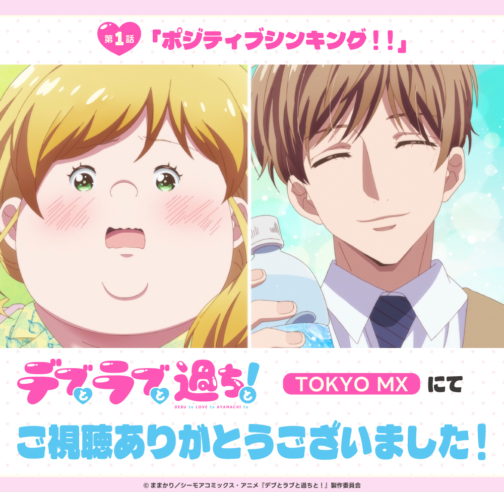 /⋰ TVアニメ #デブとラブと過ちと! 💛ご視聴ありがとうございました💛 \⋱ 第1話「ポジティブシンキング!!」をご視聴いただき ありがとうございました💖 感想は #アニメデブラブ で投稿してくださいね✨ 🍬公式HP s.mxtv.jp/anime/debulove/ #デブラブ