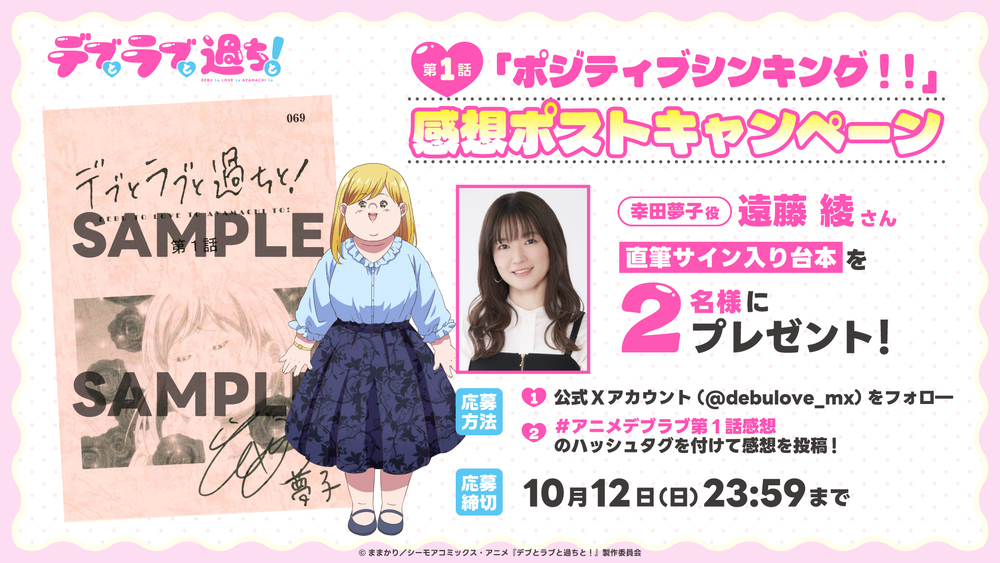 /⋰ #アニメデブラブ 💛感想投稿キャンペーン💛 \⋱ 幸田夢子役 #遠藤綾 さんのサイン入り台本を 2名様にプレゼント✨ [応募方法] ①@debulove_mx をフォロー ② #アニメデブラブ第1話感想 をつけて感想をポスト [応募期間] 10月12日(日)23:59まで 🍬注意事項はこちら s.mxtv.jp/anime/debulove…