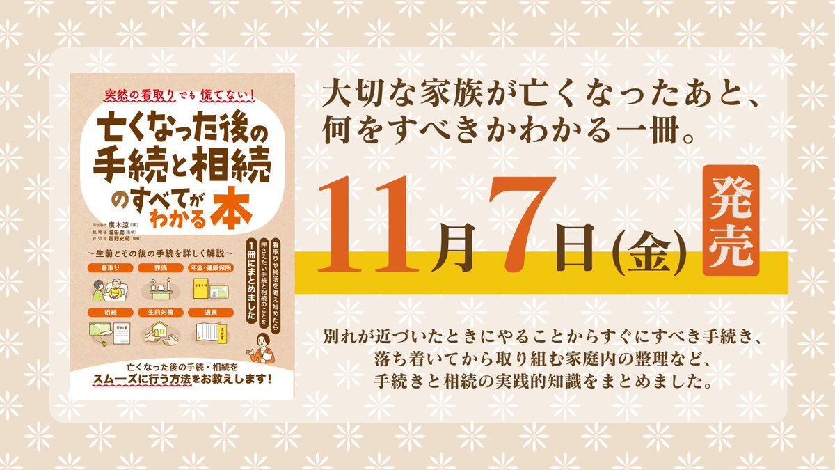 🌟11月7日発売新刊🌟 「突然の看取りでも慌てない!亡くなった後の手続と相続のすべてがわかる本」廣木涼@hiroki_abelia著 📝ご予約はこちら→amazon.co.jp/dp/4800730449/ 相続や手続きについて、知っておきたい事柄をまとめました🌱迷いやすいポイントもやさしく解説します。 #相続 #遺産 pic.x.com/euGnI6dbUY