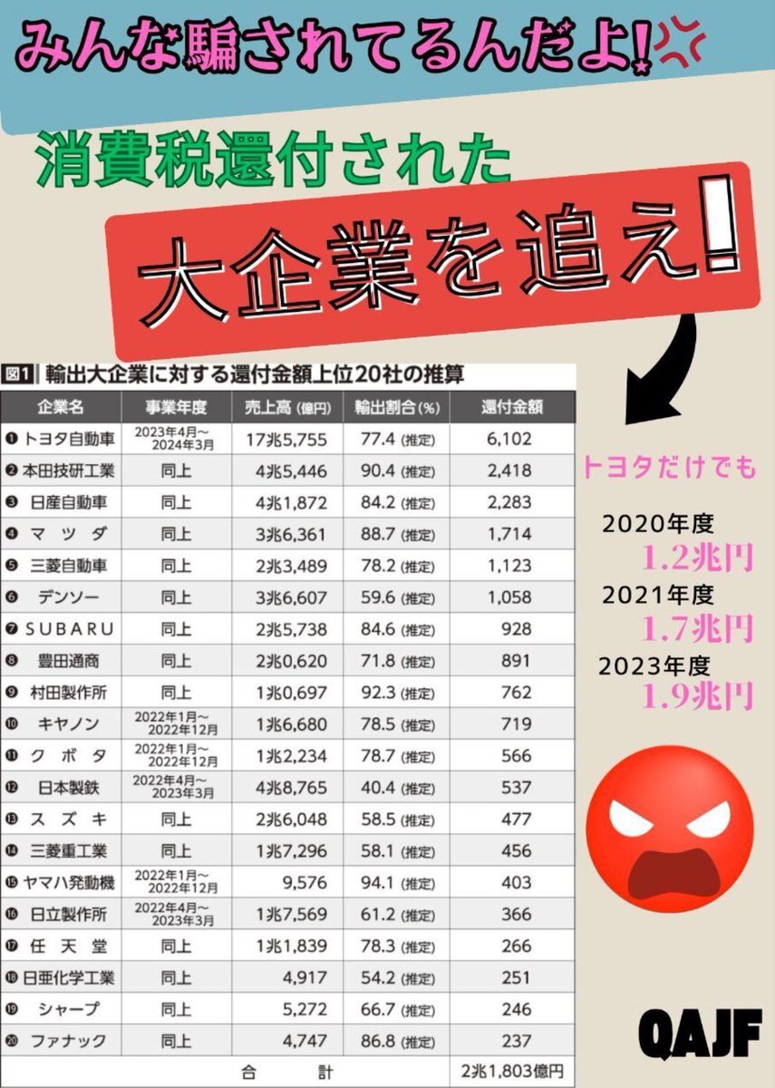トヨタ日産マツダ…大企業は消費税を払っていない🔥 下請け泣かせの大企業早く潰れてしまえ💢 #消費税廃止 #国税庁解体 #還付金 pic.x.com/L968bxg6yK x.com/iambackhuh6/st…